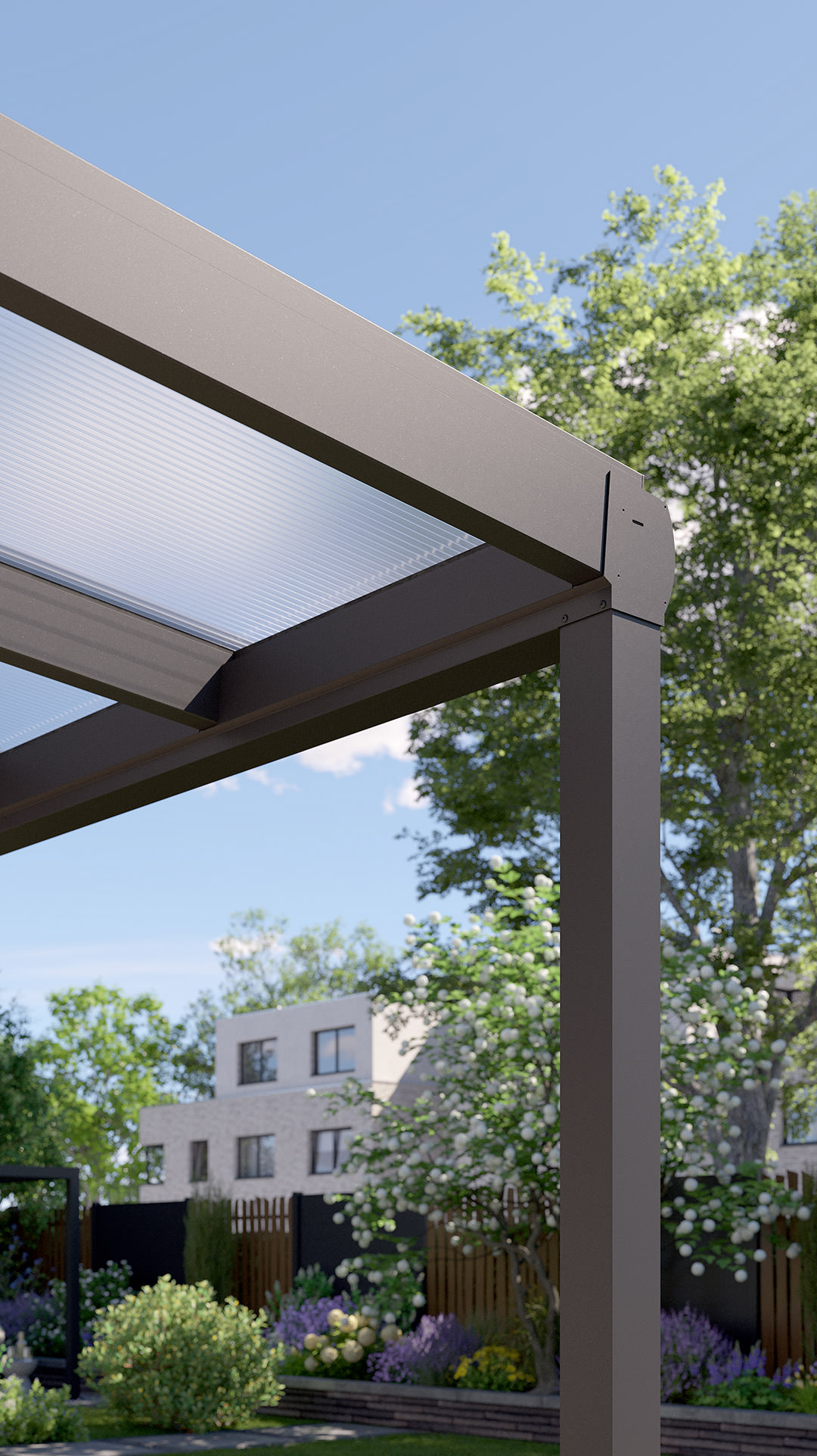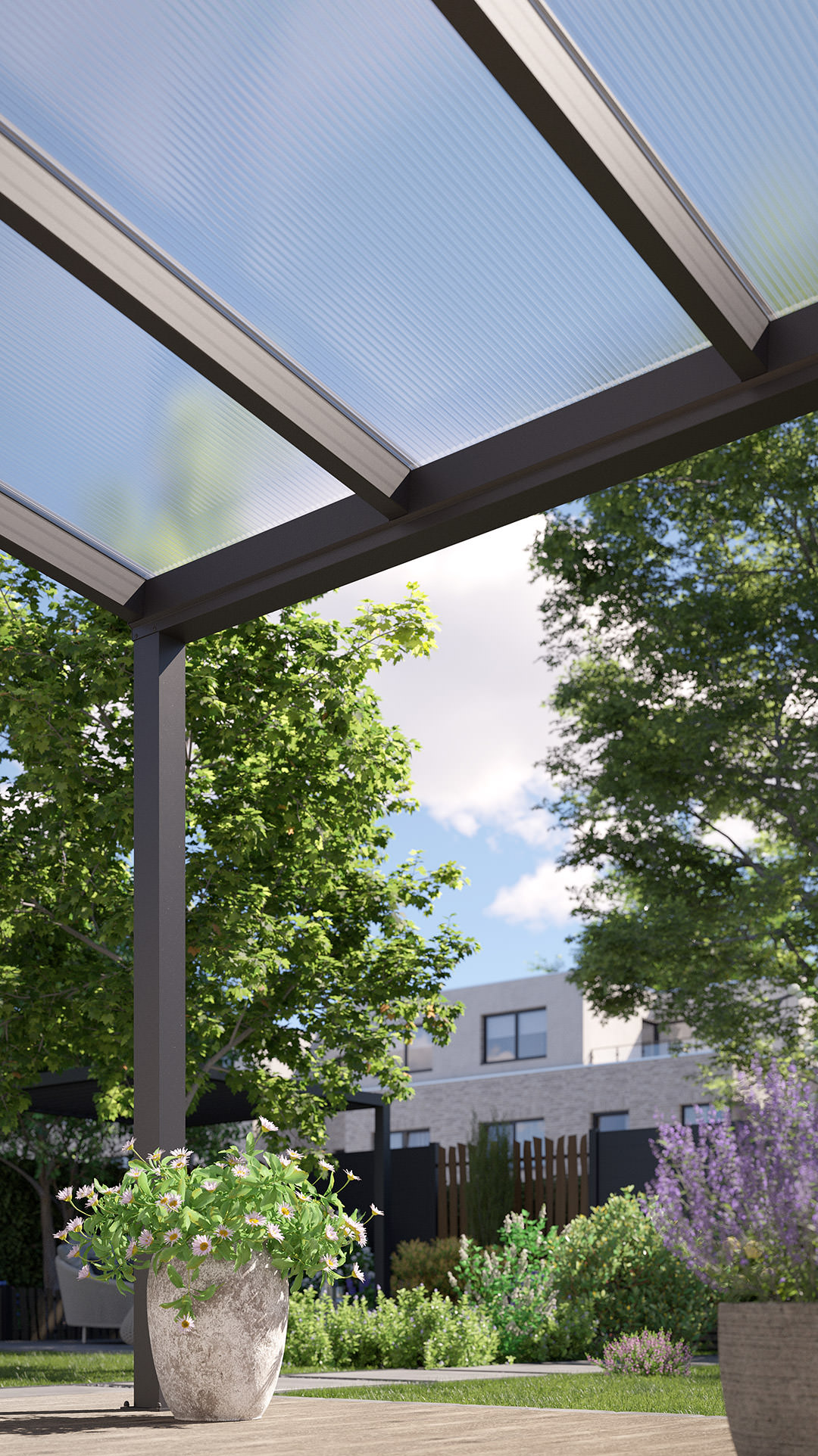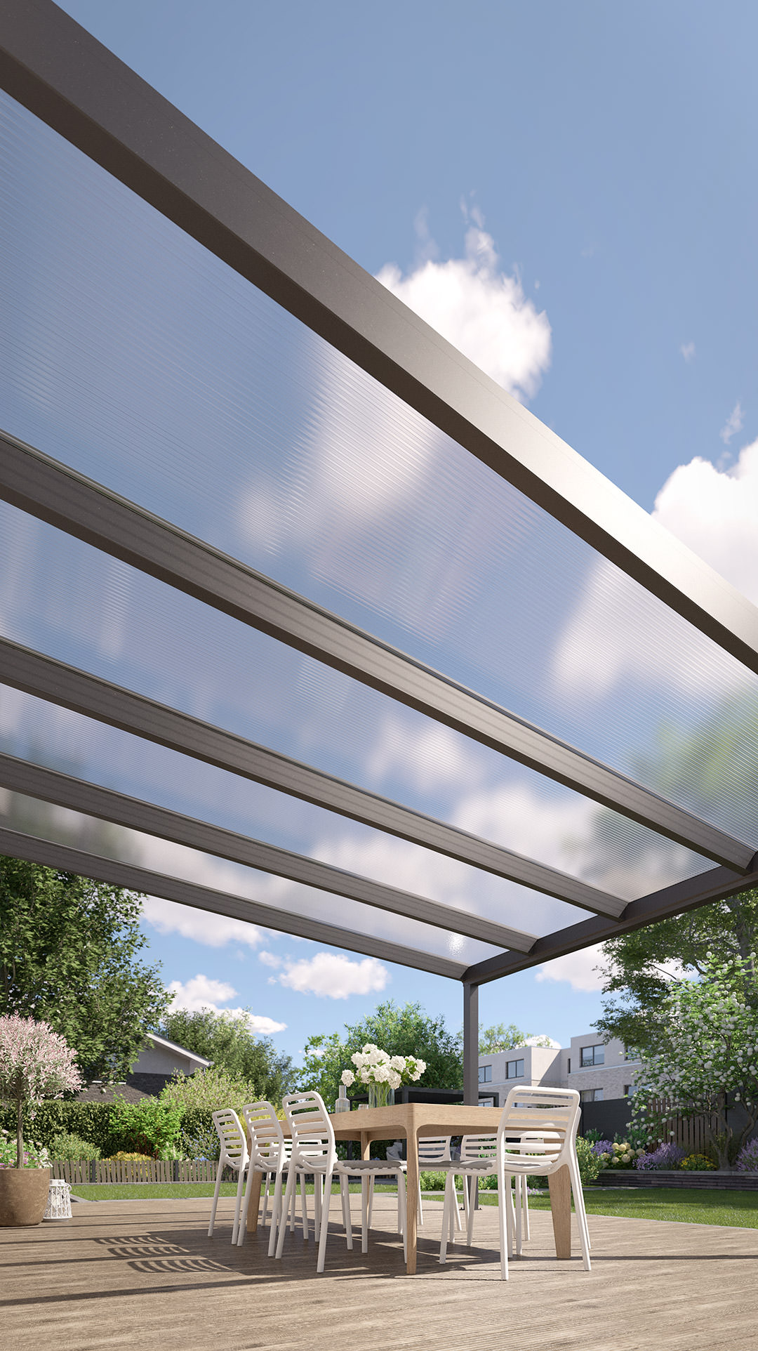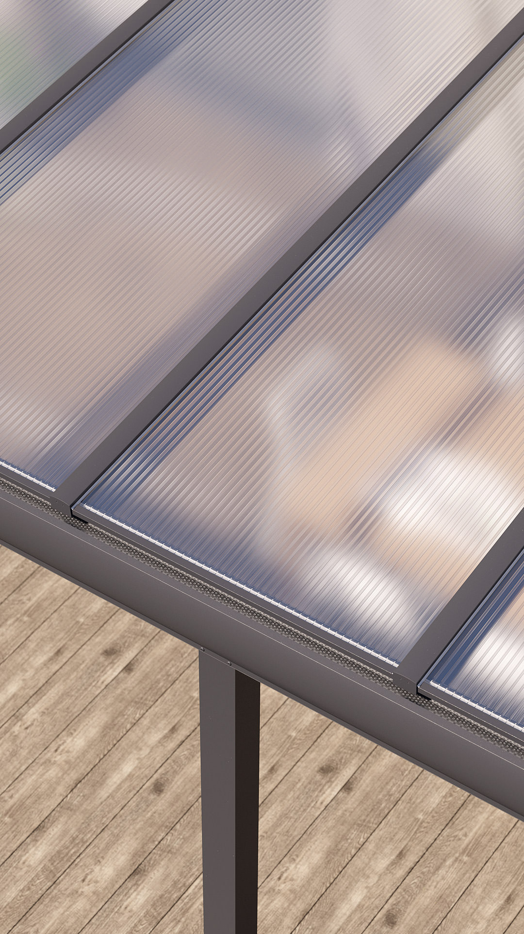 Die Profile werden aus hochwertigem Aluminium stranggepresst wodurch eine vollkommen ebene und gleichmäßige Oberfläche erreicht wird. Entgegen zahlreicher Anbieter von Billig-Überdachungen bestehen unsere REXOpremium®-Profile aus bis zu 4mm starkem Material. So sind alle tragenden Elemente verzugsfrei und alles bleibt, auch bei höheren Belastungen, dauerhaft so wie am ersten Tag.