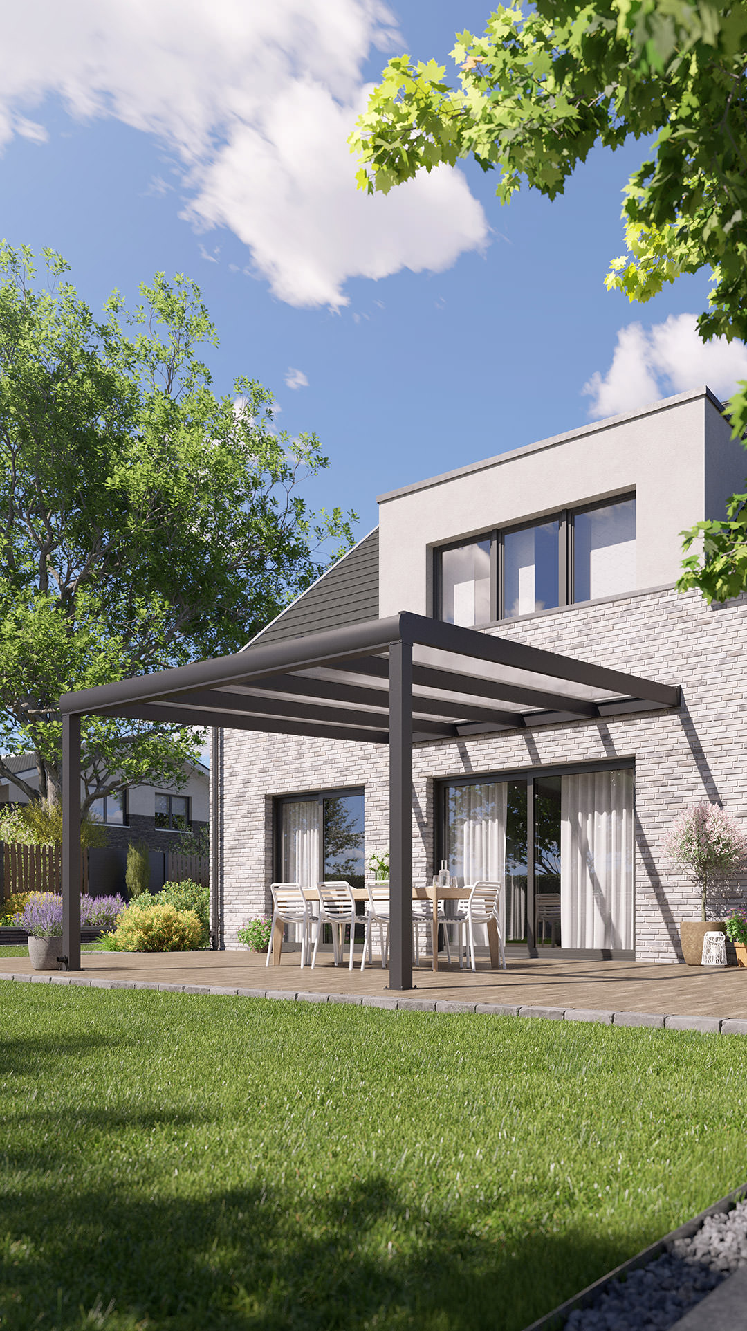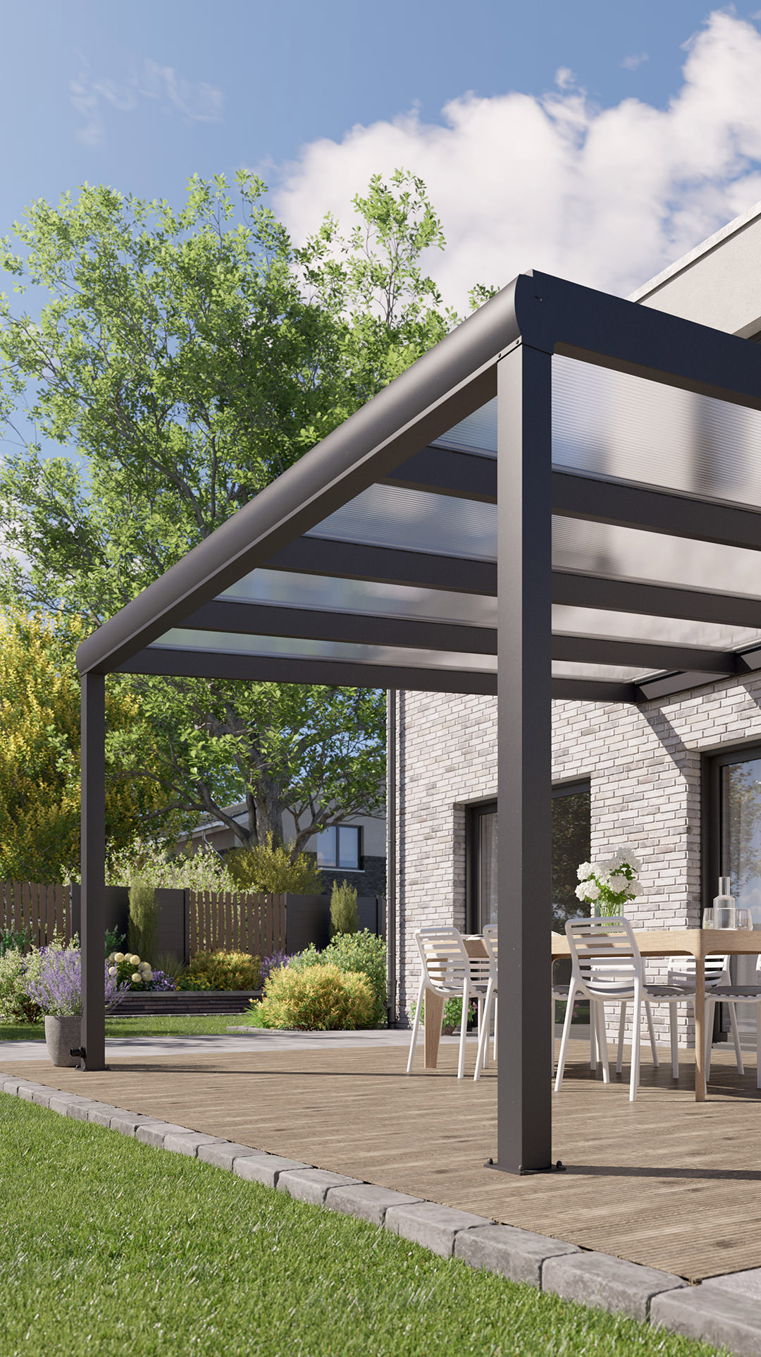 Komplette Terrassenüberdachung 4m x 4m mit Unterkonstruktion aus pulverbeschichtetem Aluminium