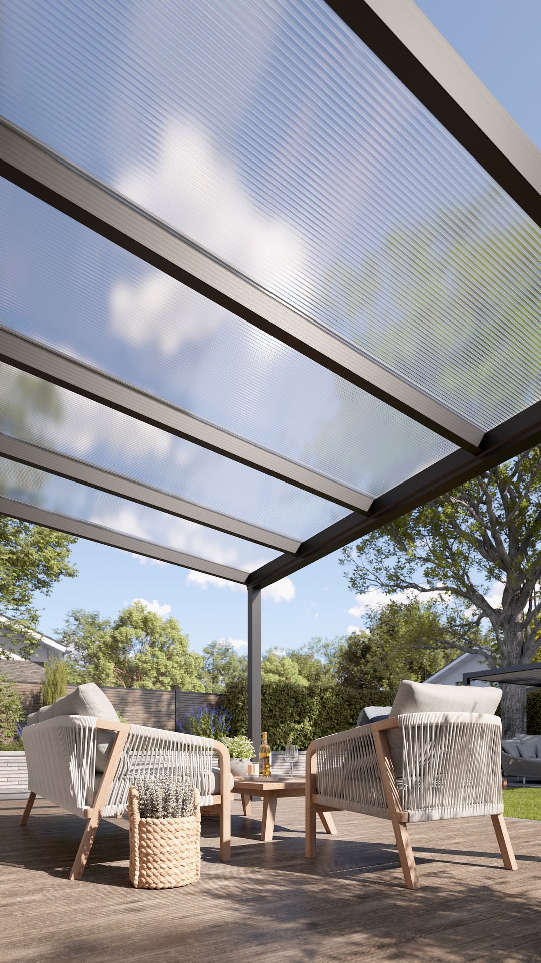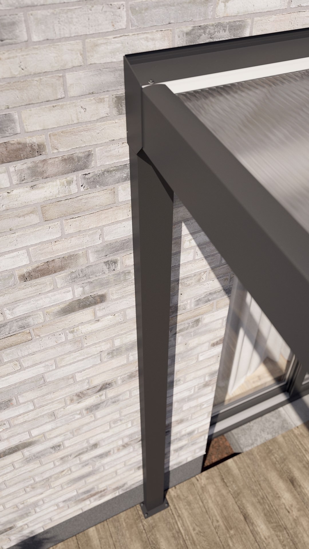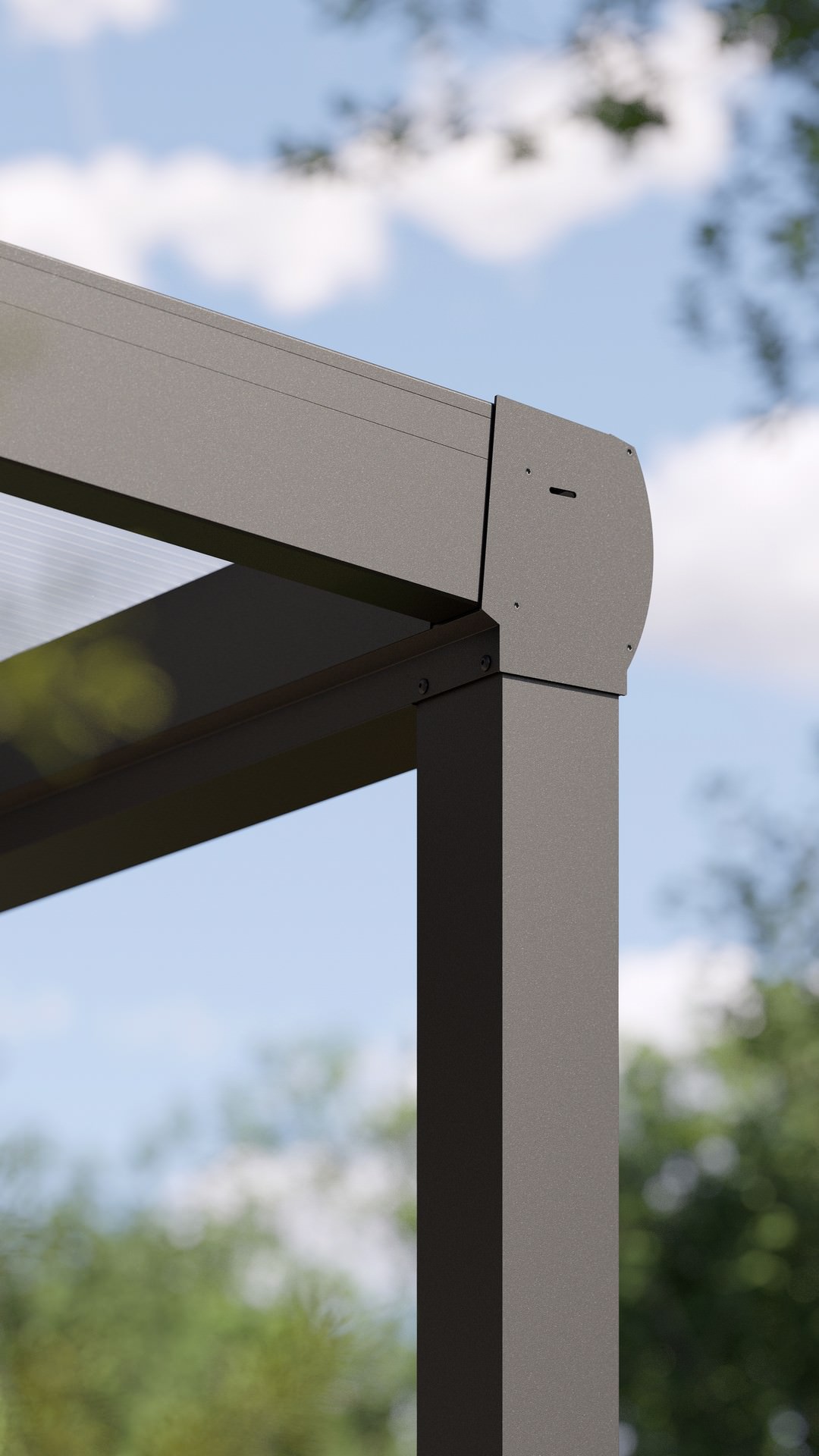 Komplette Terrassenüberdachung 3 m x 3,5 m mit Unterkonstruktion aus pulverbeschichtetem Aluminium und Wandpfosten