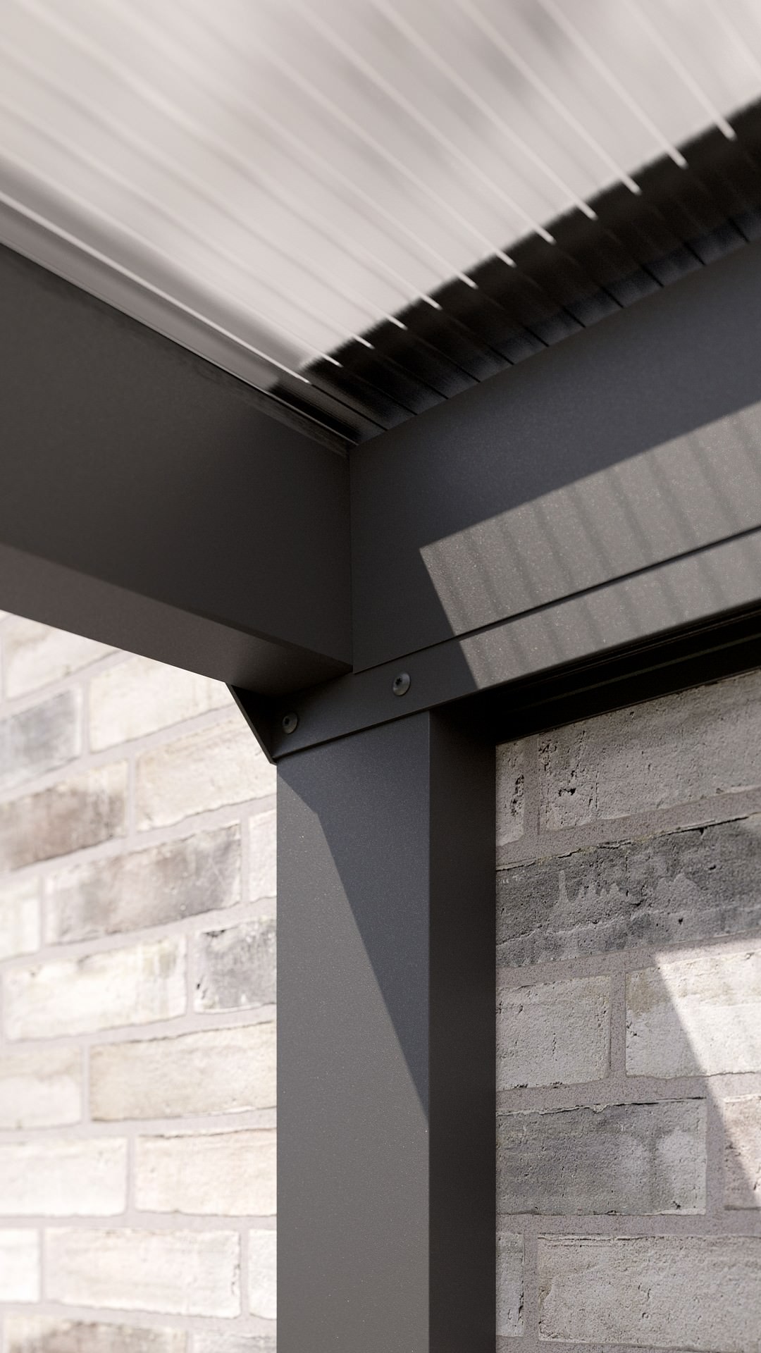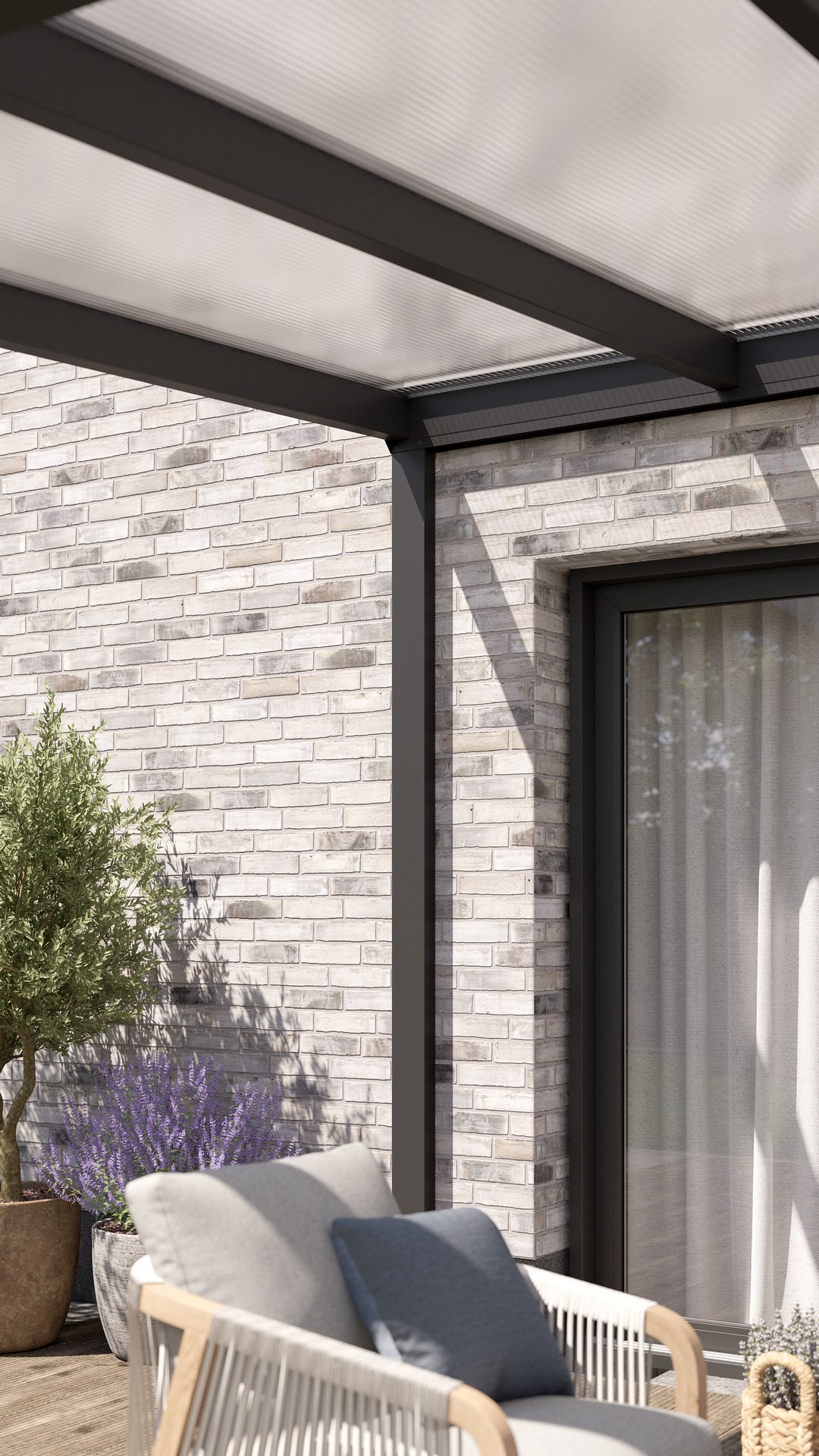 Unsere REXOpremium® VSG Aluminium-Terrassenüberdachung mit Wandpfosten ermöglicht eine sichere Montage der Überdachung an Fassaden mit geringer Traglast oder bei einer vorhandenen Wärmedämmung.