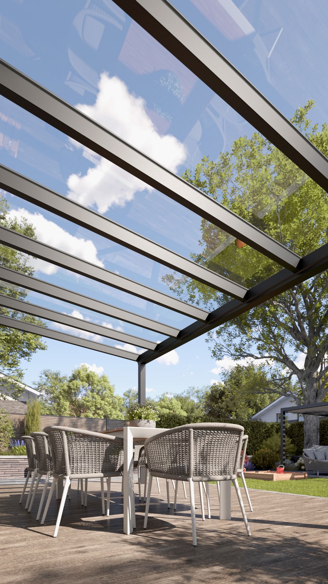 Oder sie ergänzen die Terrassenüberdachung mit Seitenwänden als Sicht- und Windschutz. Der Ausbau des Terrassendachs zu einem komplett geschlossenen Gartenzimmer ist mit unseren Glasschiebewänden und Seitenkeilen direkt oder auch nachträglich möglich.