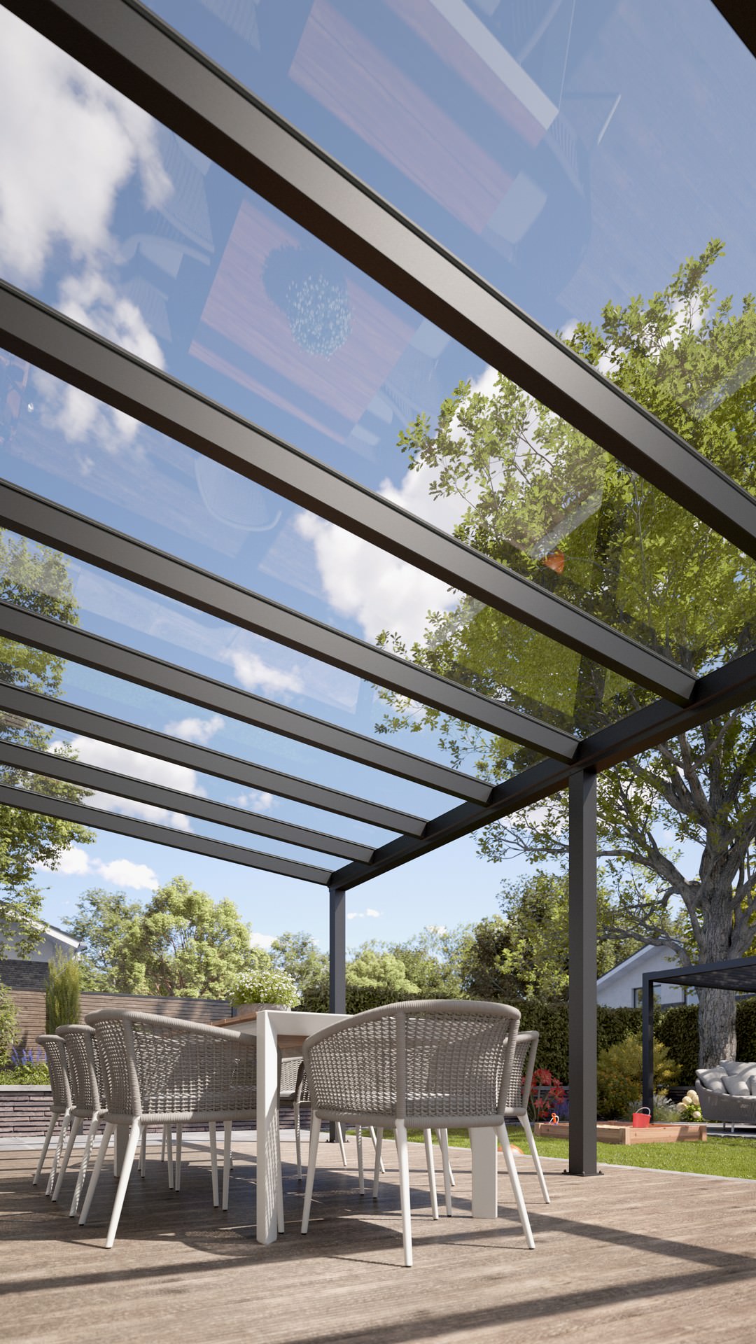 Oder sie ergänzen die Terrassenüberdachung mit Seitenwänden als Sicht- und Windschutz. Der Ausbau des Terrassendachs zu einem komplett geschlossenen Gartenzimmer ist mit unseren Glasschiebewänden und Seitenkeilen direkt oder auch nachträglich möglich.