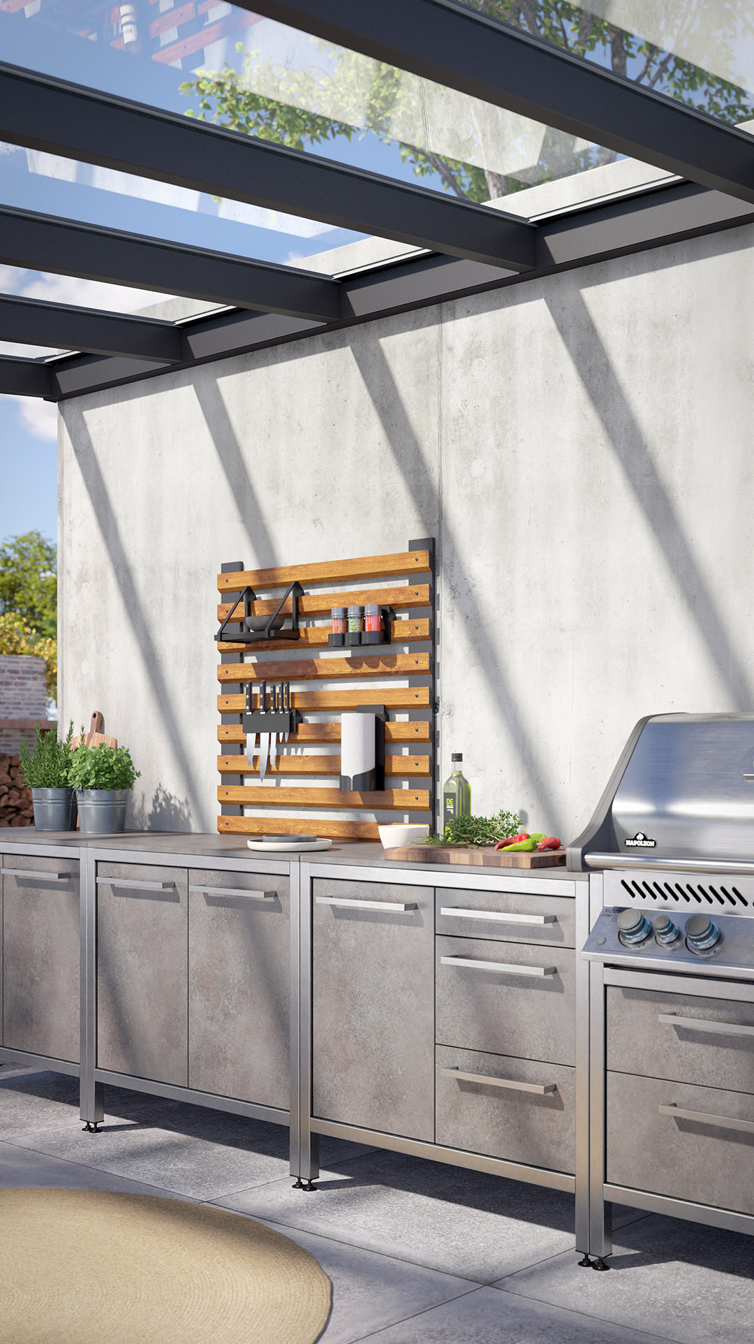 Gestalten Sie Ihre Outdoor-Küche flexibel und effizient: Das modulare French Cleat System ermöglicht es, Zubehör und Ablagen frei zu positionieren und jederzeit neu anzuordnen. So entsteht ein übersichtlicher Arbeitsbereich, auf dem alles griffbereit bleibt und der verfügbare Platz optimal genutzt wird.