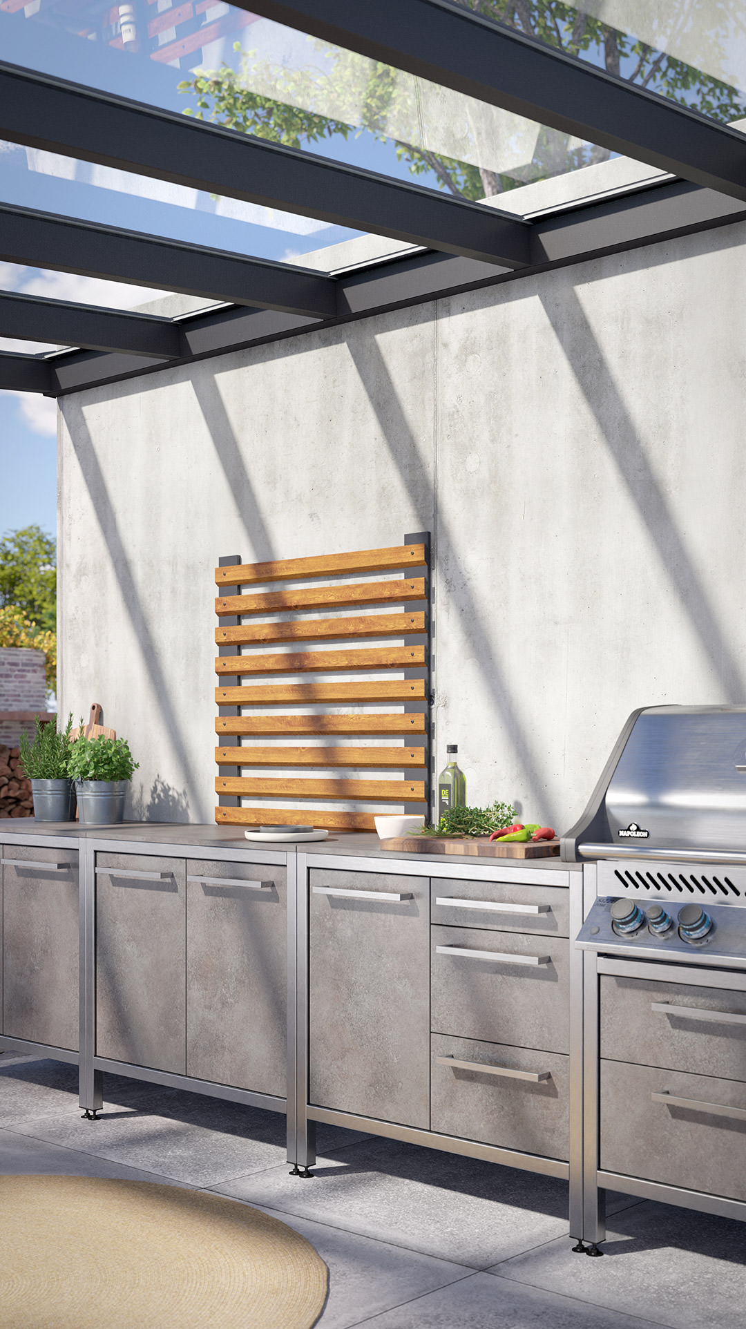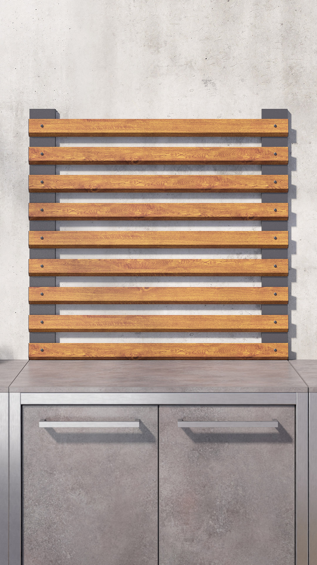 Unsere REXOkitchen® French Cleat Outdoor-Küchenwand aus beschichteten Rhombusprofilen bringt Struktur und Stil in Ihre Outdoor-Küche und schafft einen klar organisierten, funktionalen Kochbereich.