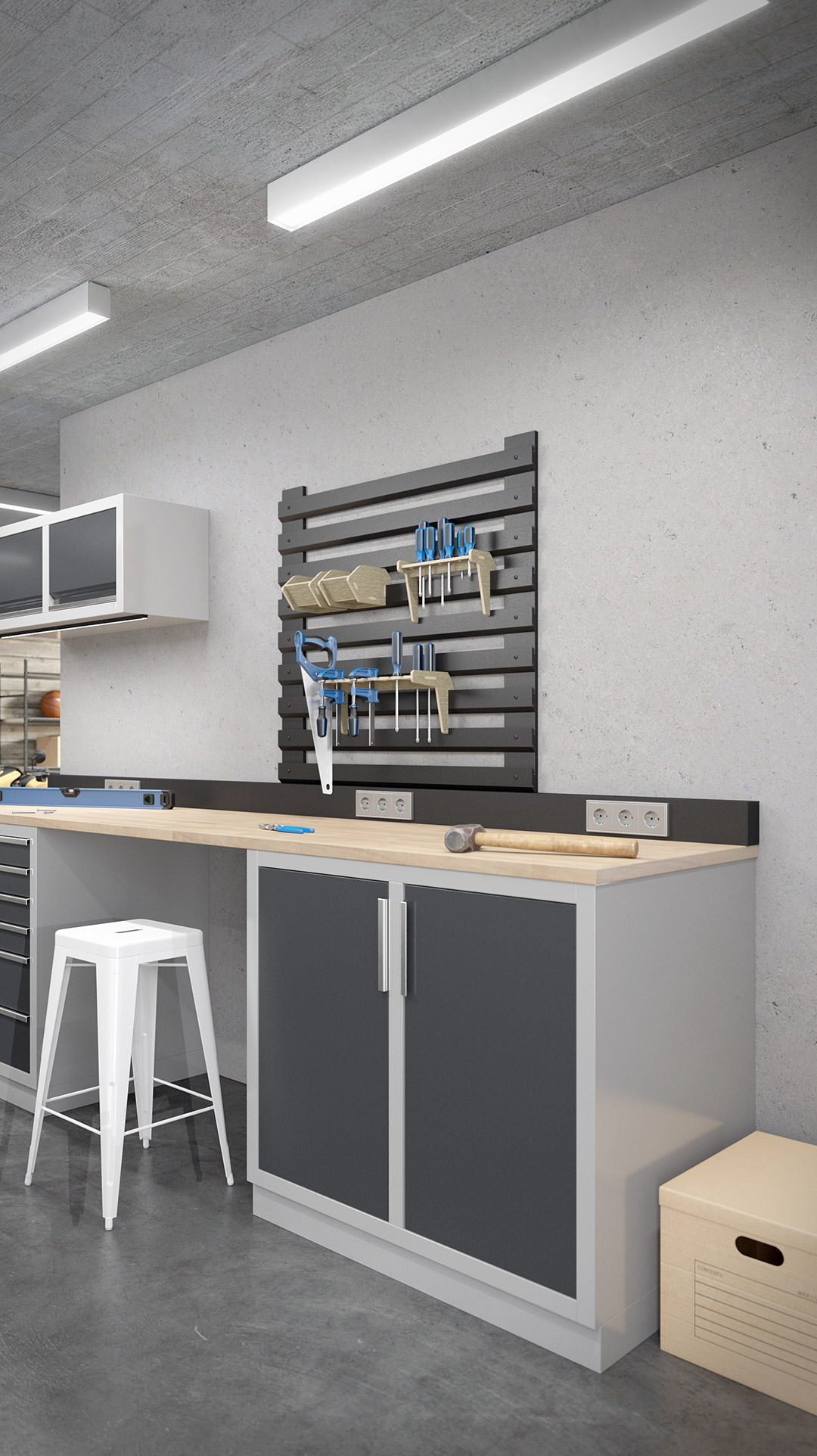 - Flexible Aufhängung von Werkzeugen, Regalen und Zubehör
