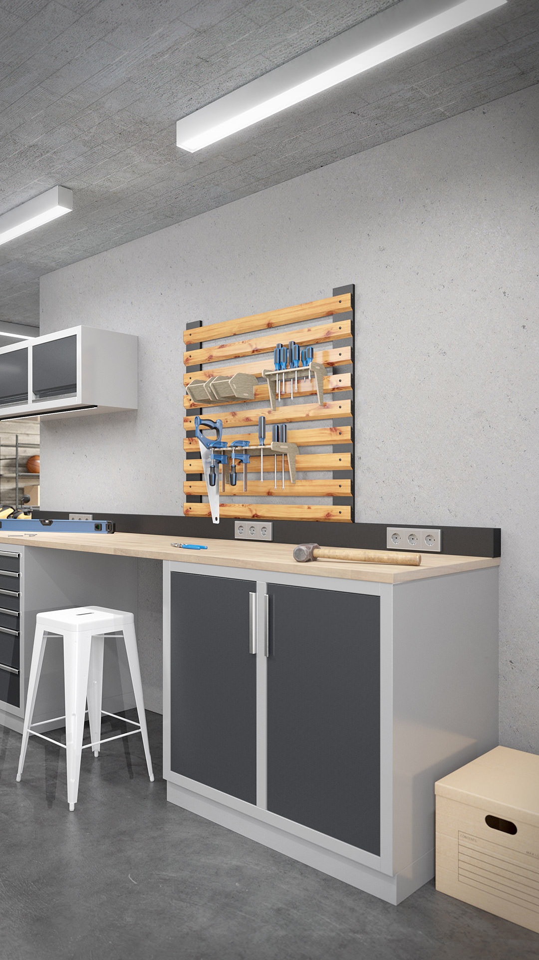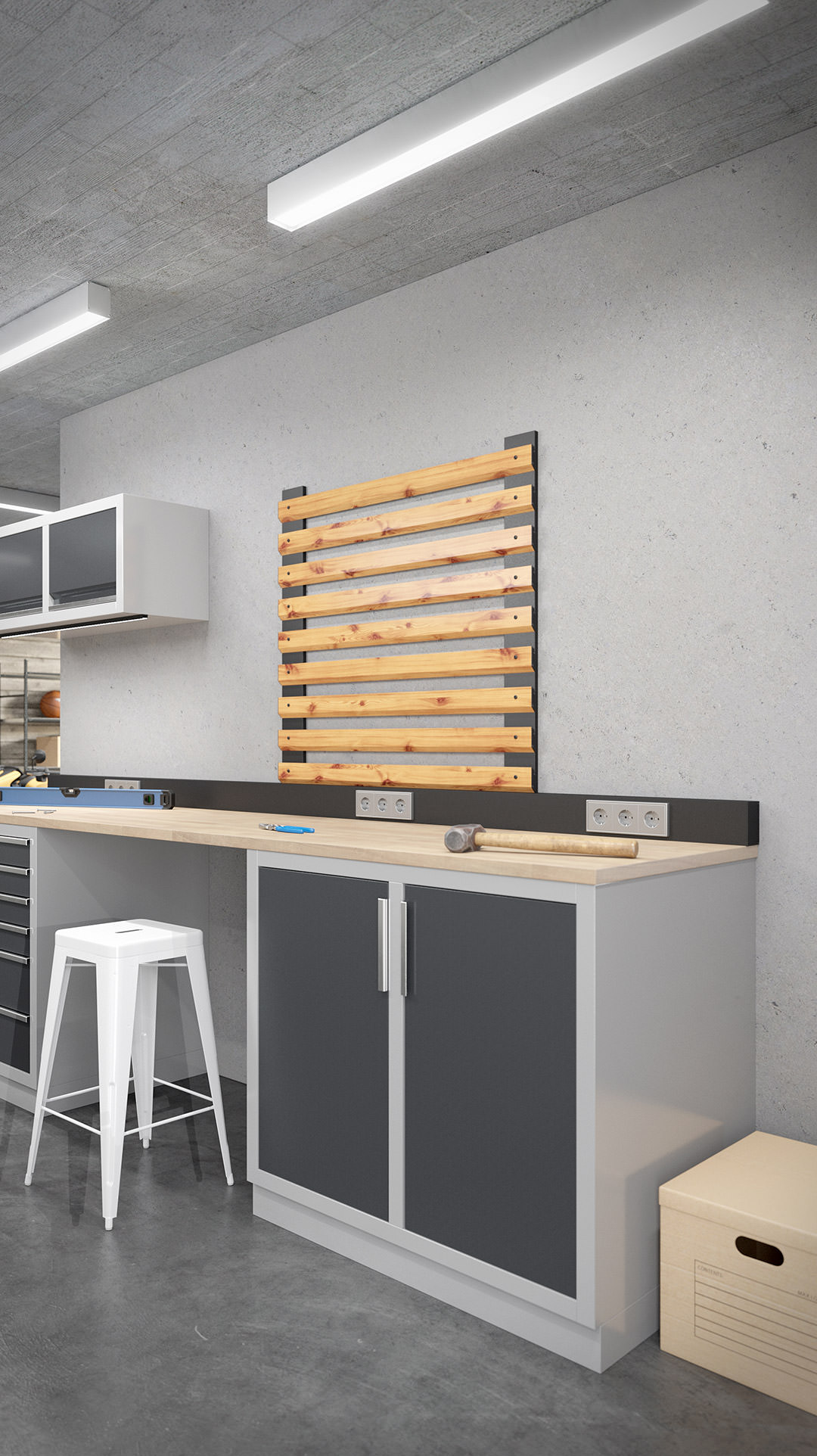- Flexible Aufhängung von Werkzeugen, Regalen und Zubehör