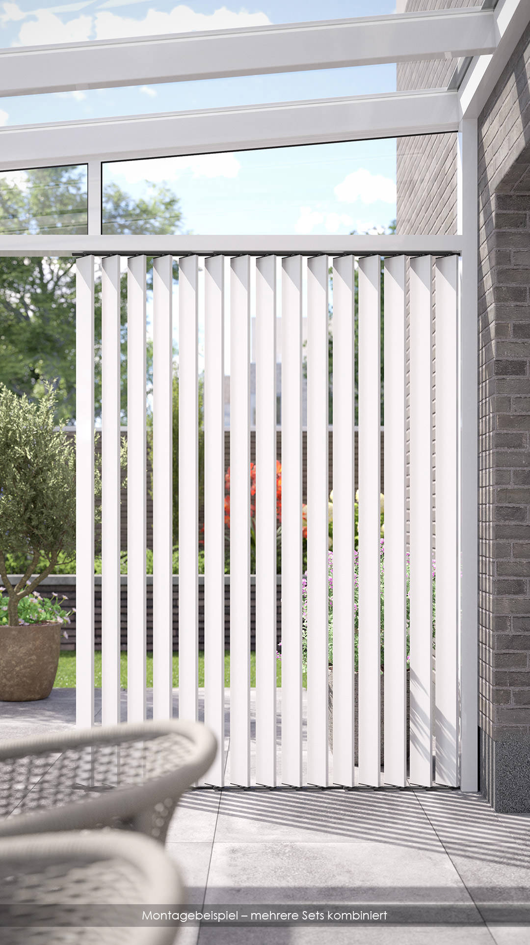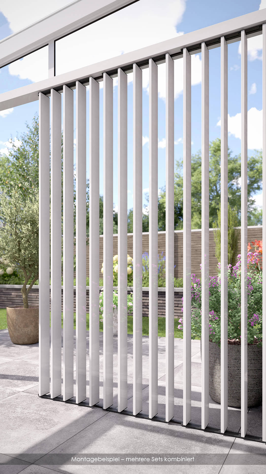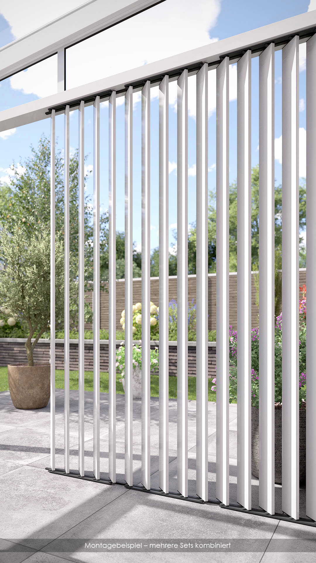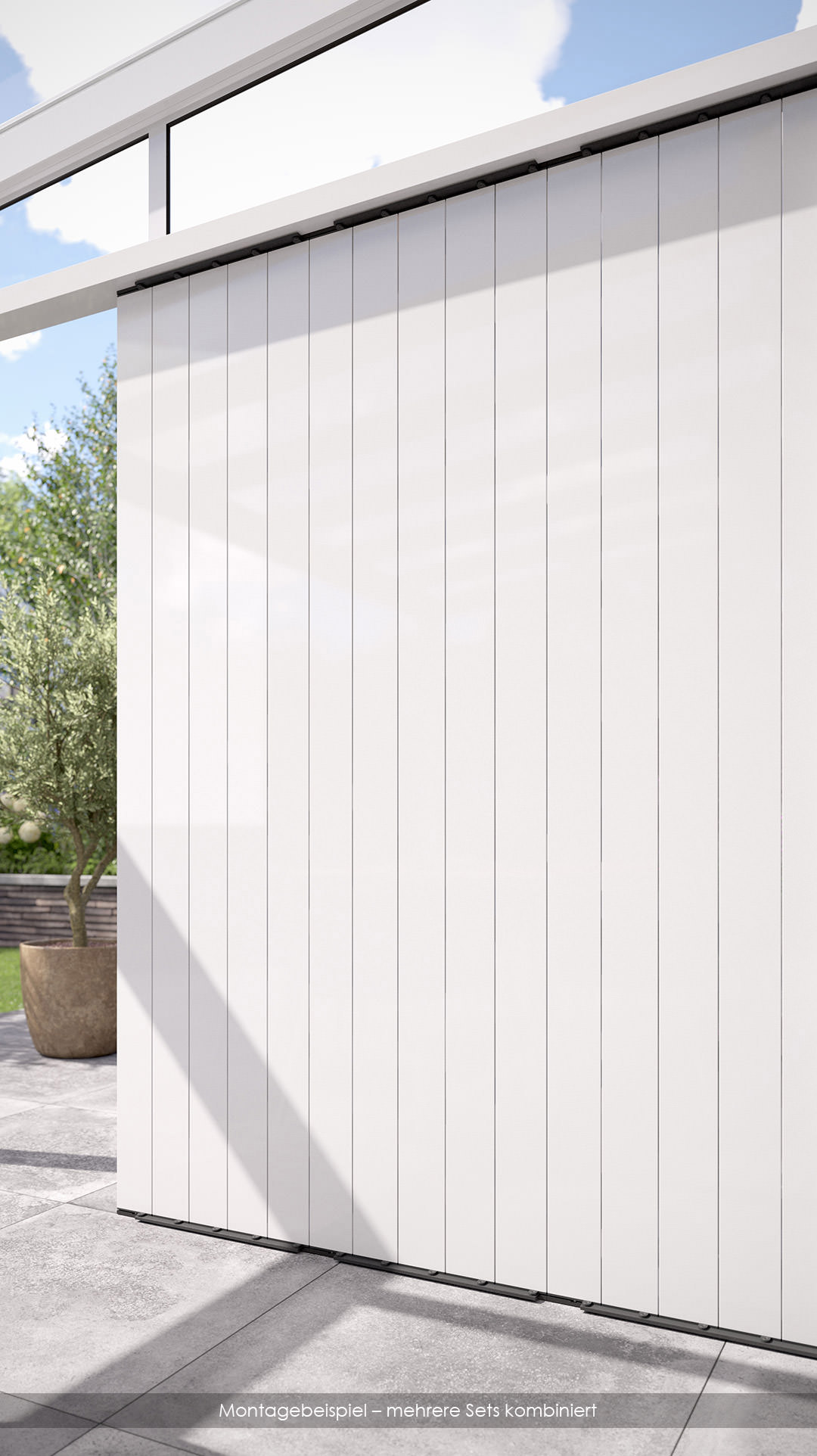 Hinweis: Unser Montageset enthält fünf Lamellen. Je nach gewünschter Breite lassen sich mehrere Sets kombinieren und durchgehend montieren.