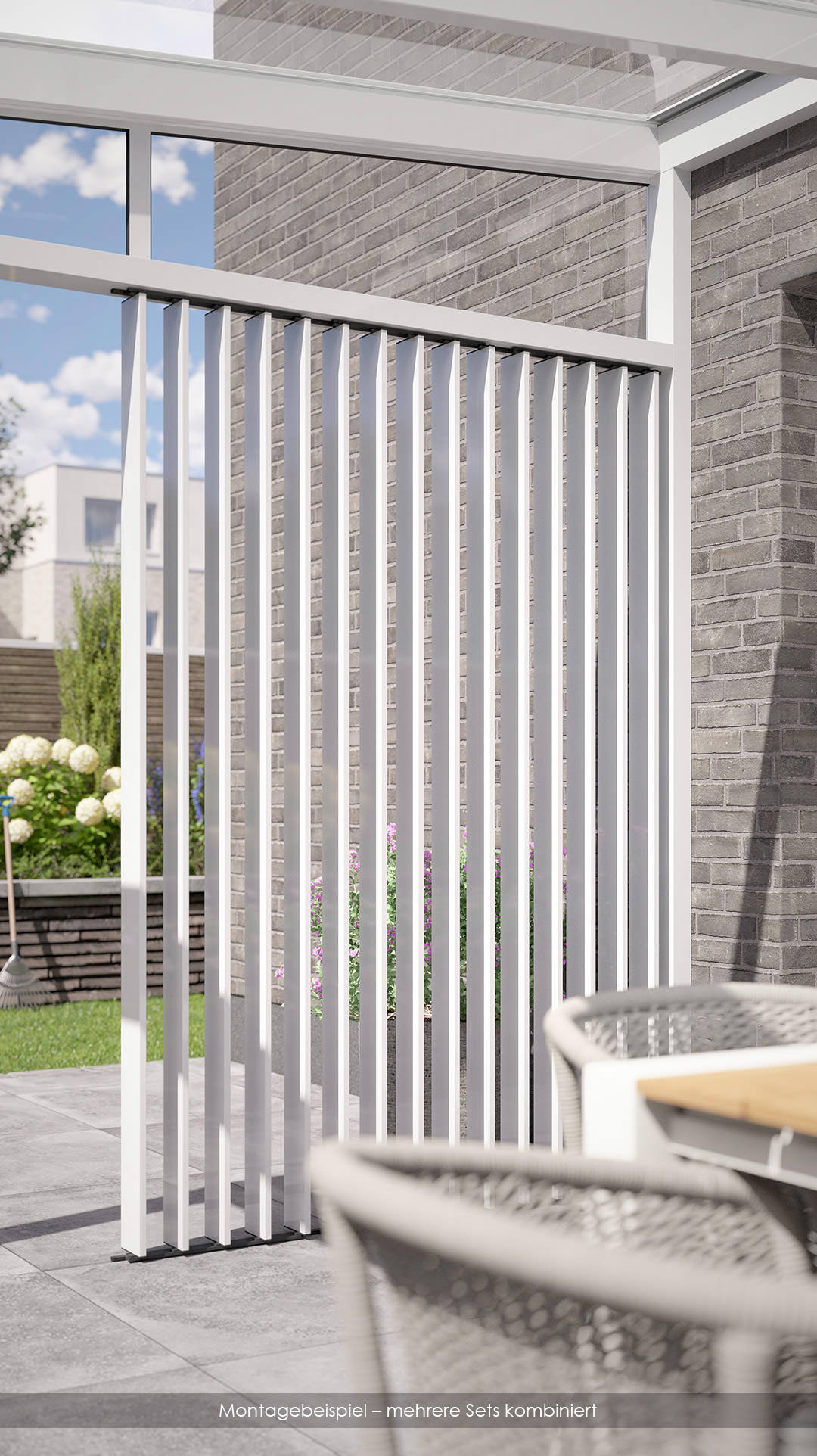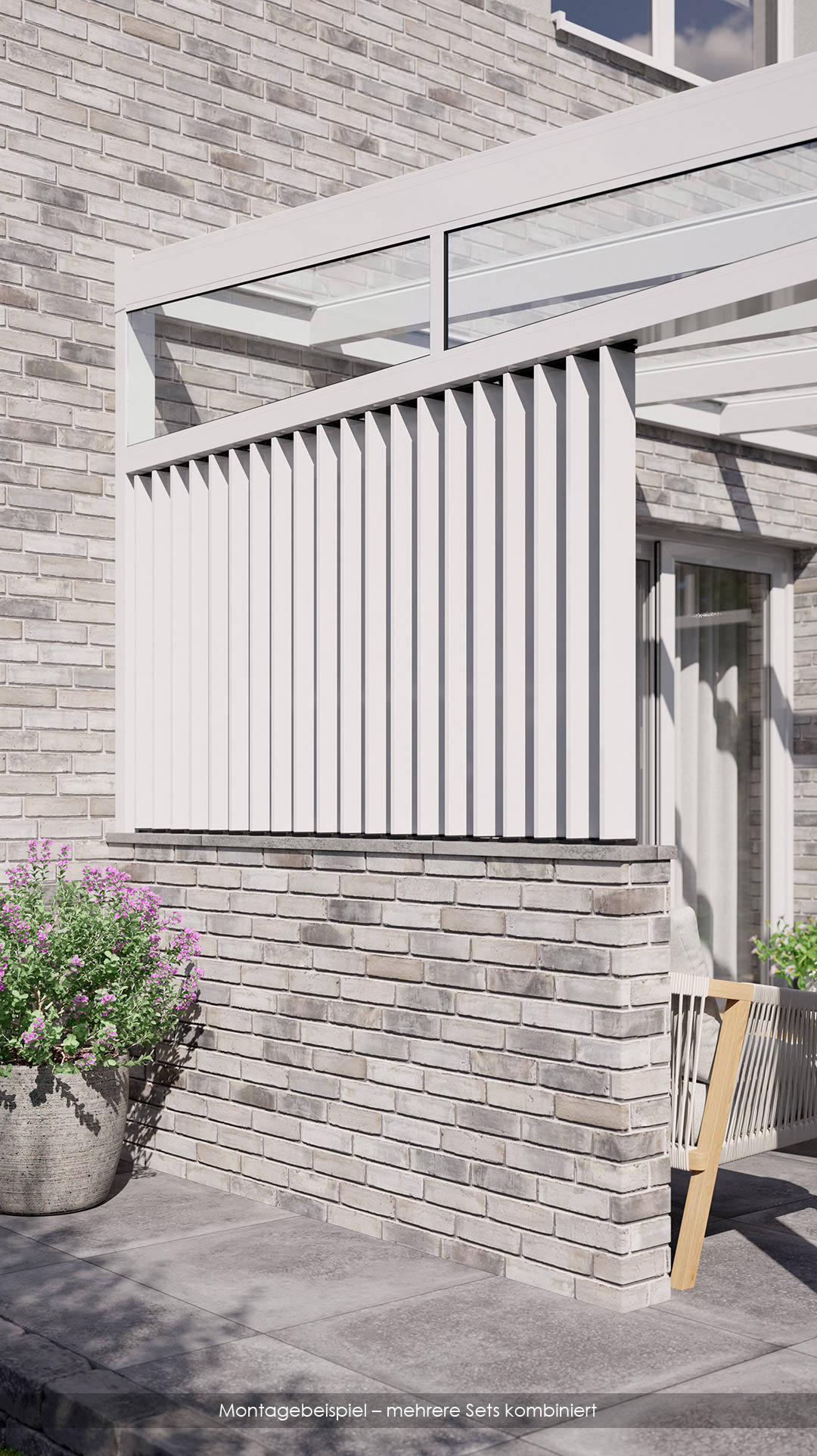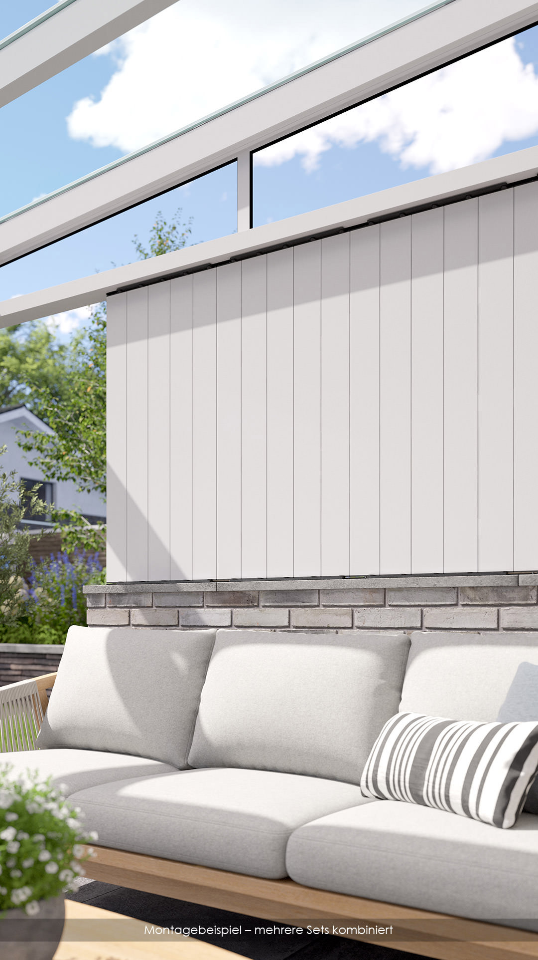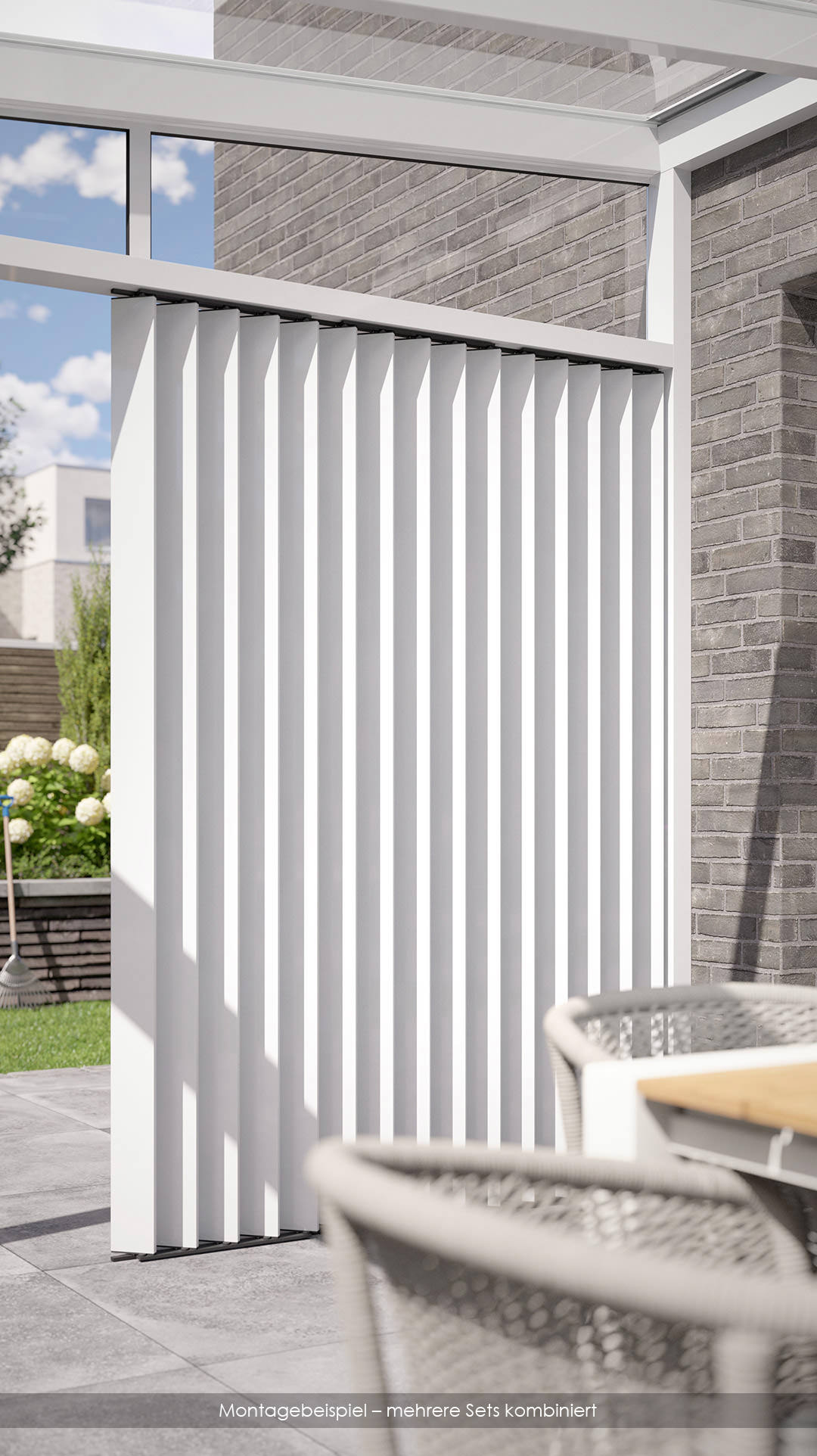 Hinweis: Unser Montageset enthält fünf Lamellen. Je nach gewünschter Breite lassen sich mehrere Sets kombinieren und durchgehend montieren.