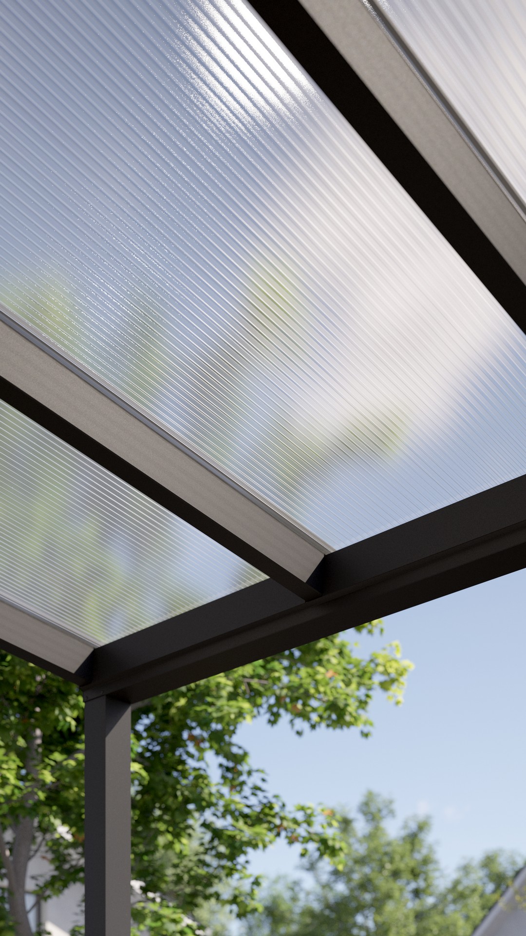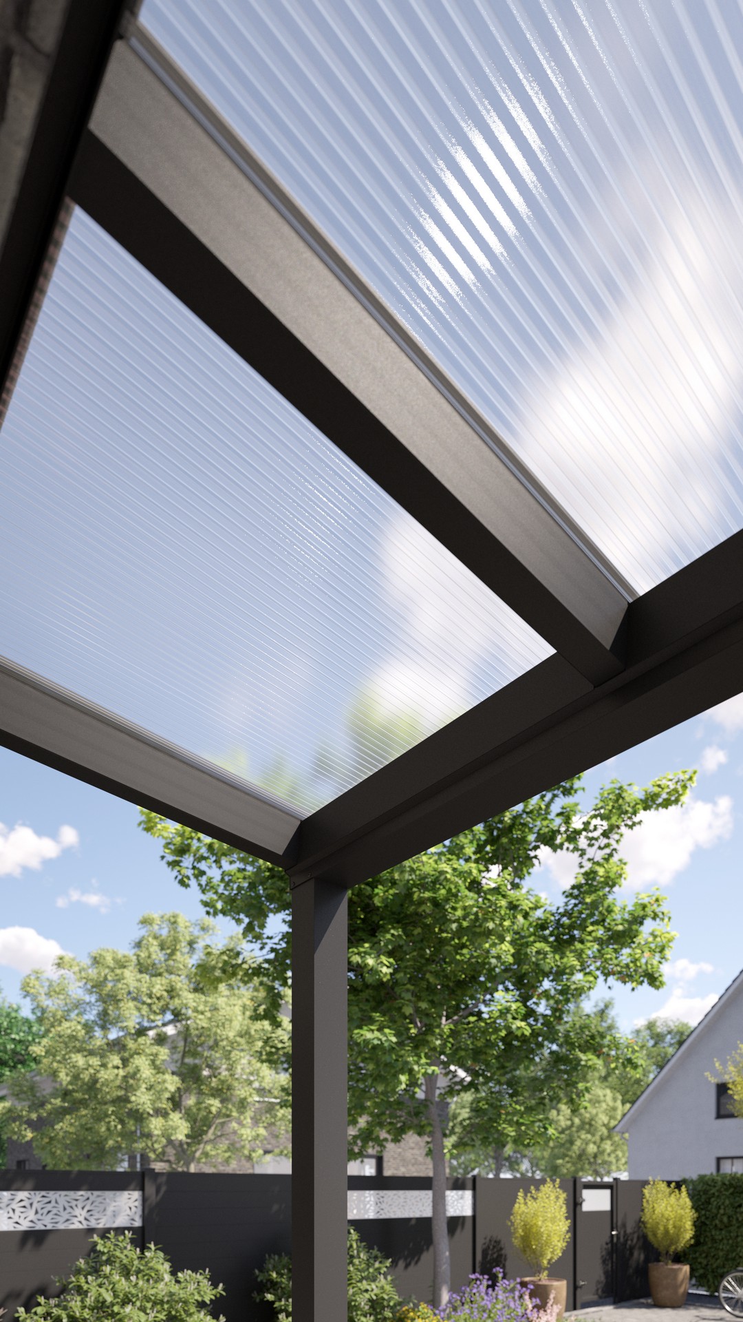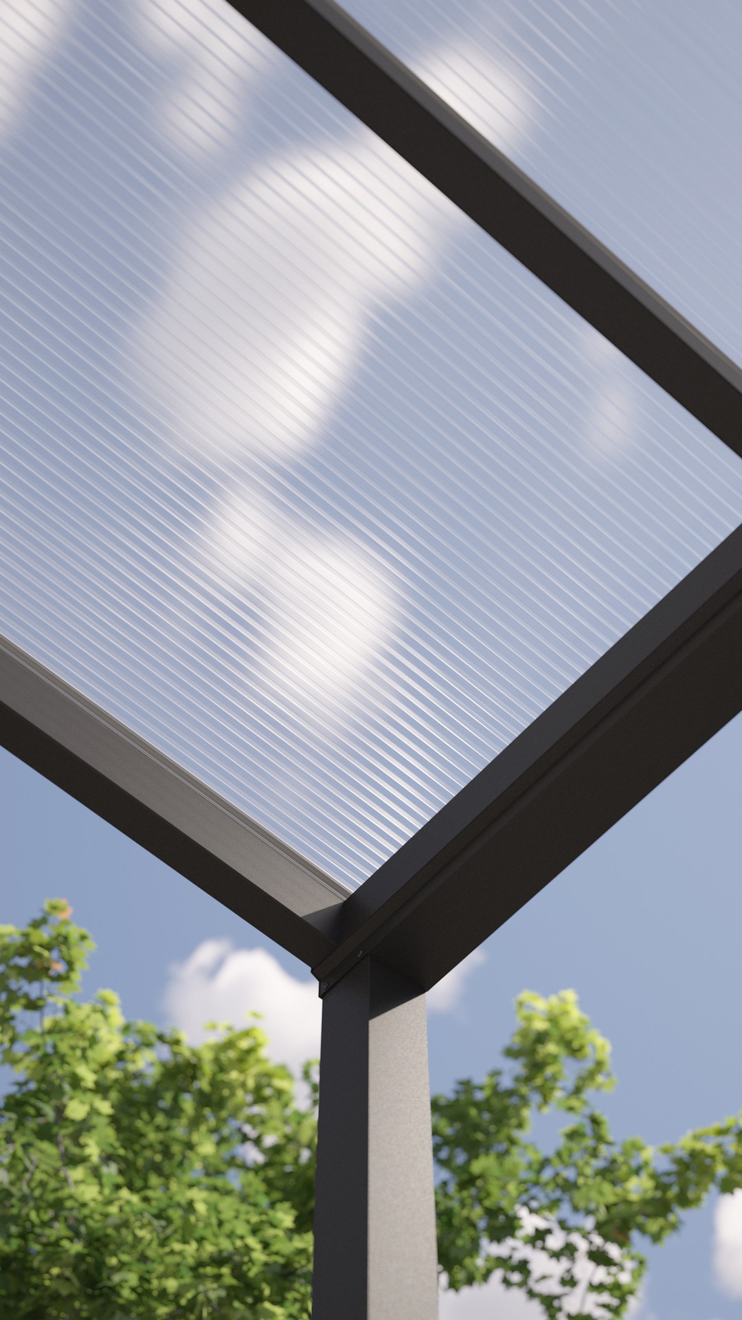 Verlassen Sie sich auf bewähre Qualität, Made in Germany: REXOvita® Vordächer verbinden eine hochwertige Aluminium-Unterkonstruktion in den Farben Weiß oder Anthrazit mit einer Dacheindeckung aus Stegplatten. Hier können Sie aus vielen attraktiven Varianten wählen – ob hochtransparent, mit sanfter Tönung oder besonderem Hitzeschutz. Und für die richtige Entwässerung sorgt eine Regenrinne, die unsichtbar im Hauptträger platziert ist.
