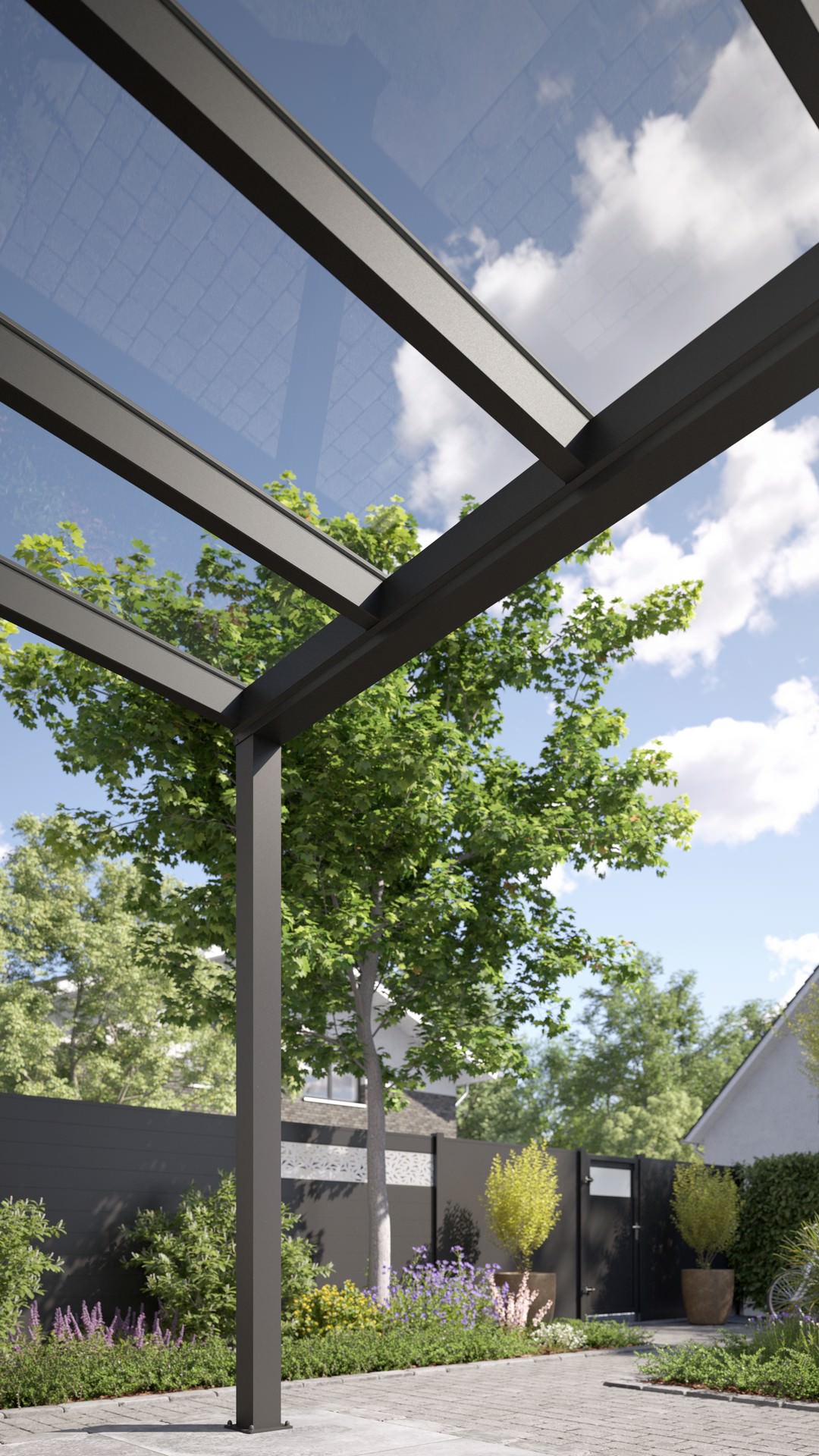 Vordach mit Unterkonstruktion aus pulverbeschichtetem Aluminium mit Wandpfosten und Glas