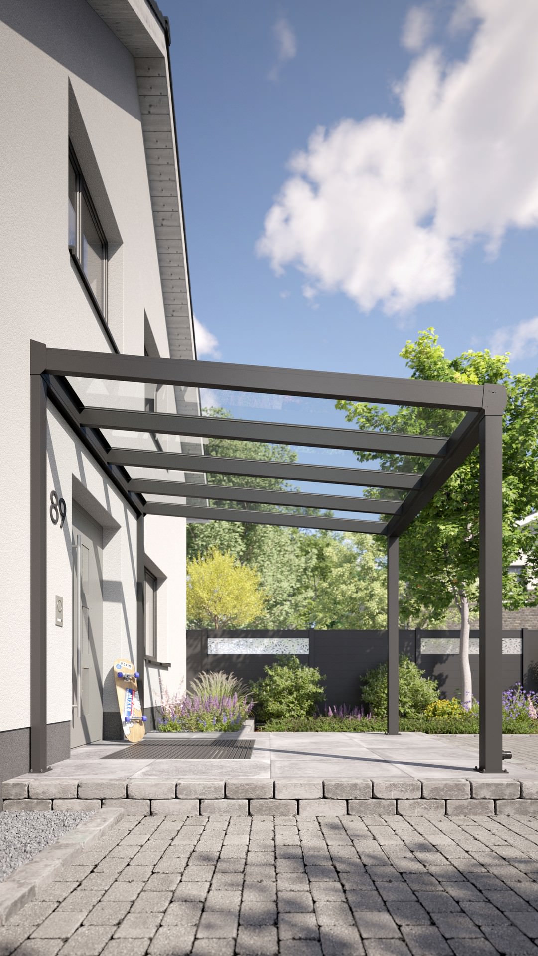 Vordach mit Unterkonstruktion aus pulverbeschichtetem Aluminium mit Wandpfosten und Glas
