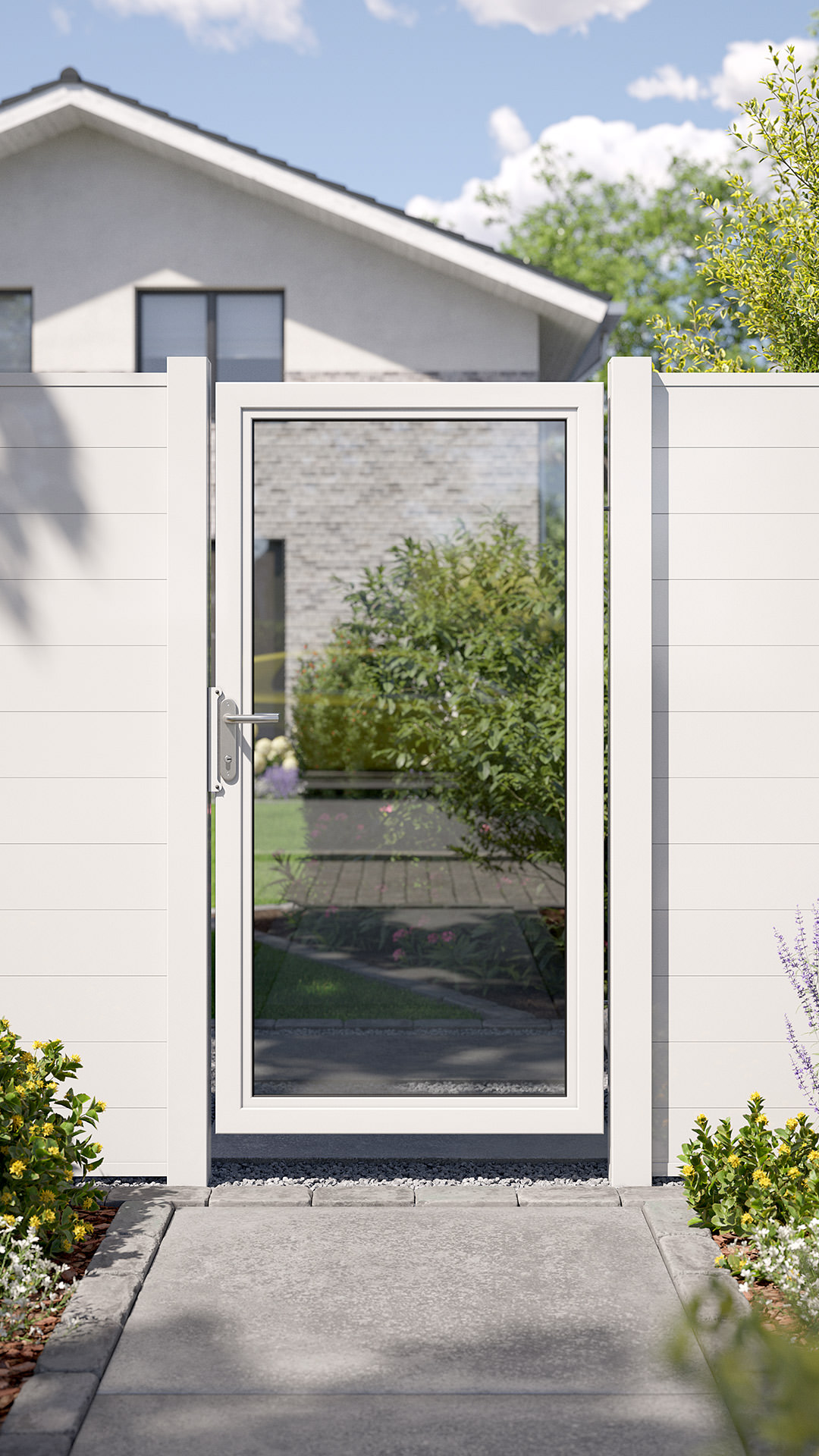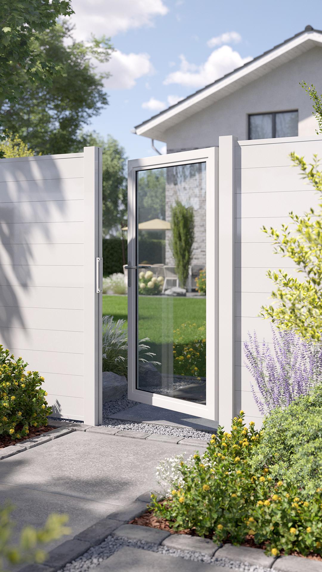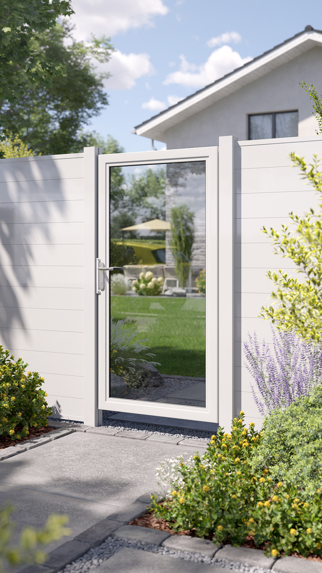 Das REXOprotect® Alu-Gartentor mit Glas-Element ist ein hochwertiges Tor für Ihren Zaun.