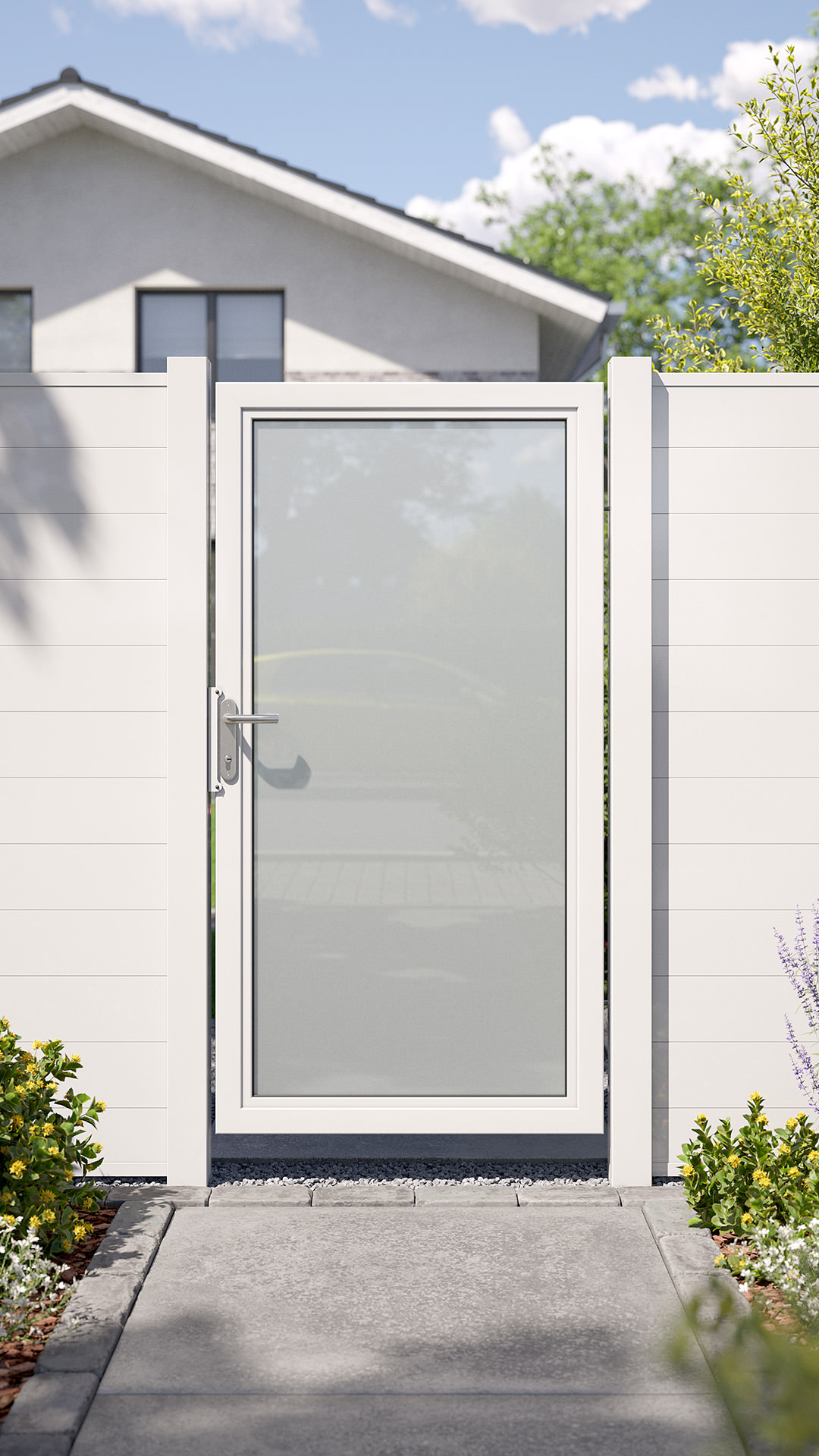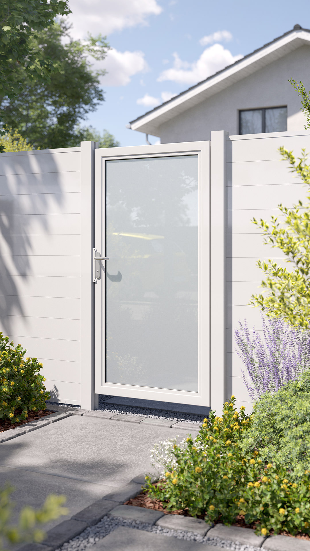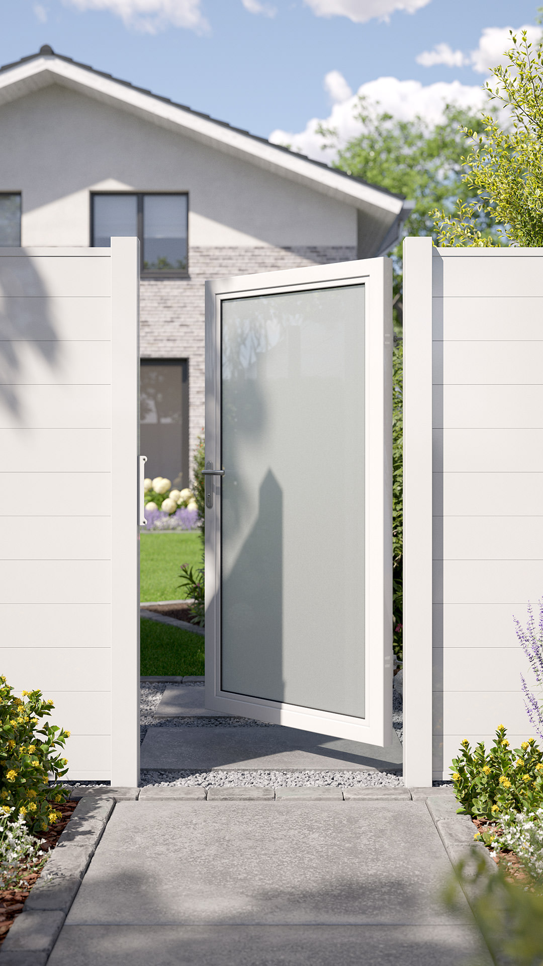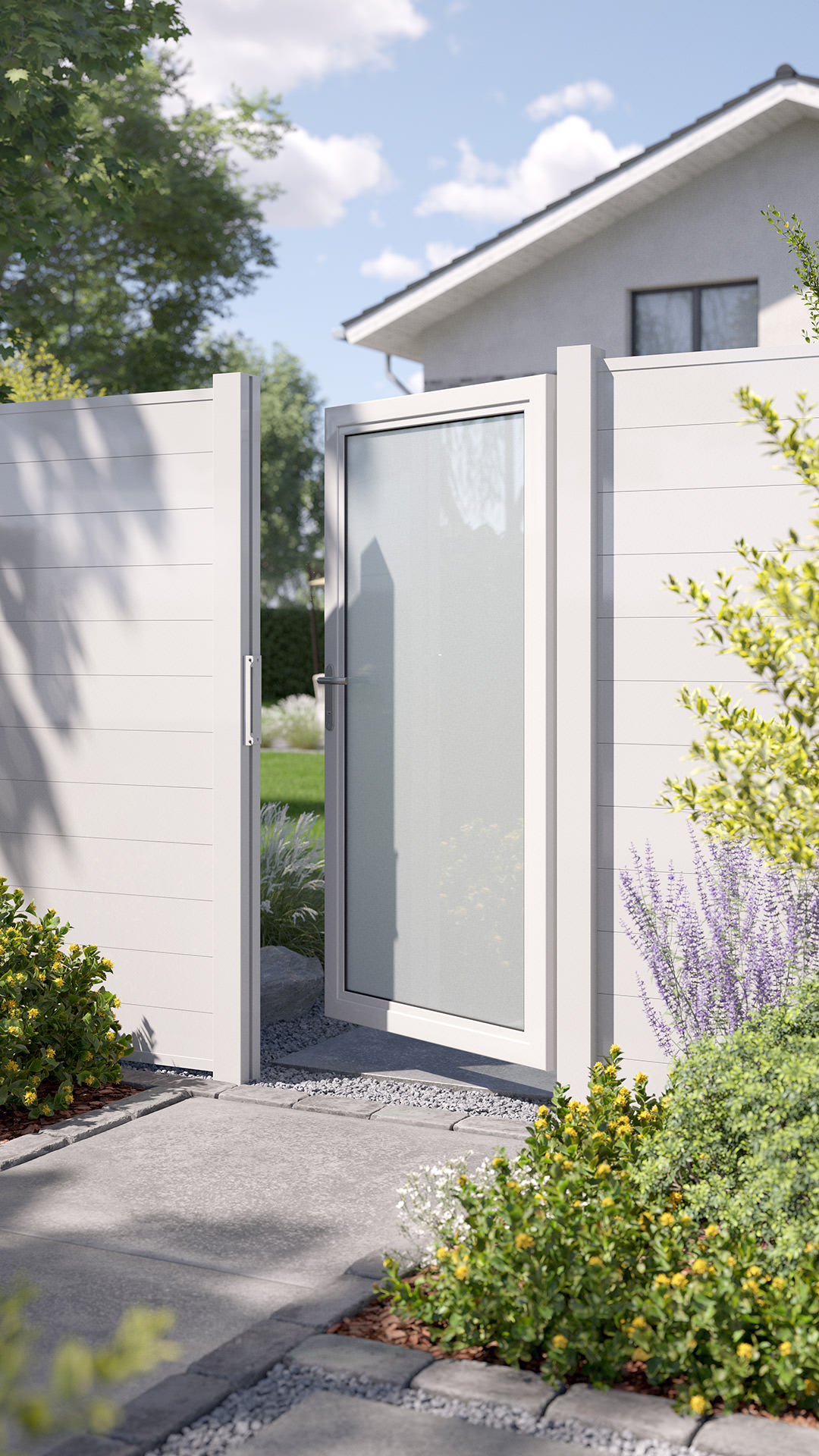 Das REXOprotect® Alu-Gartentor mit Glas-Element ist ein hochwertiges Tor für Ihren Zaun.