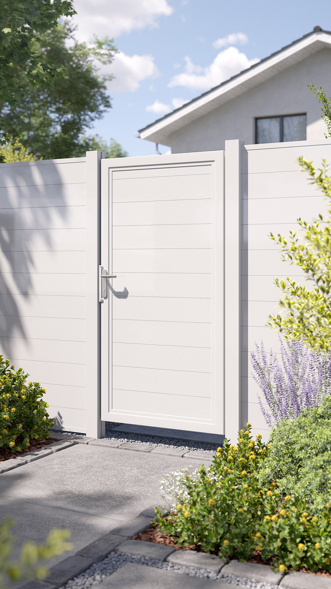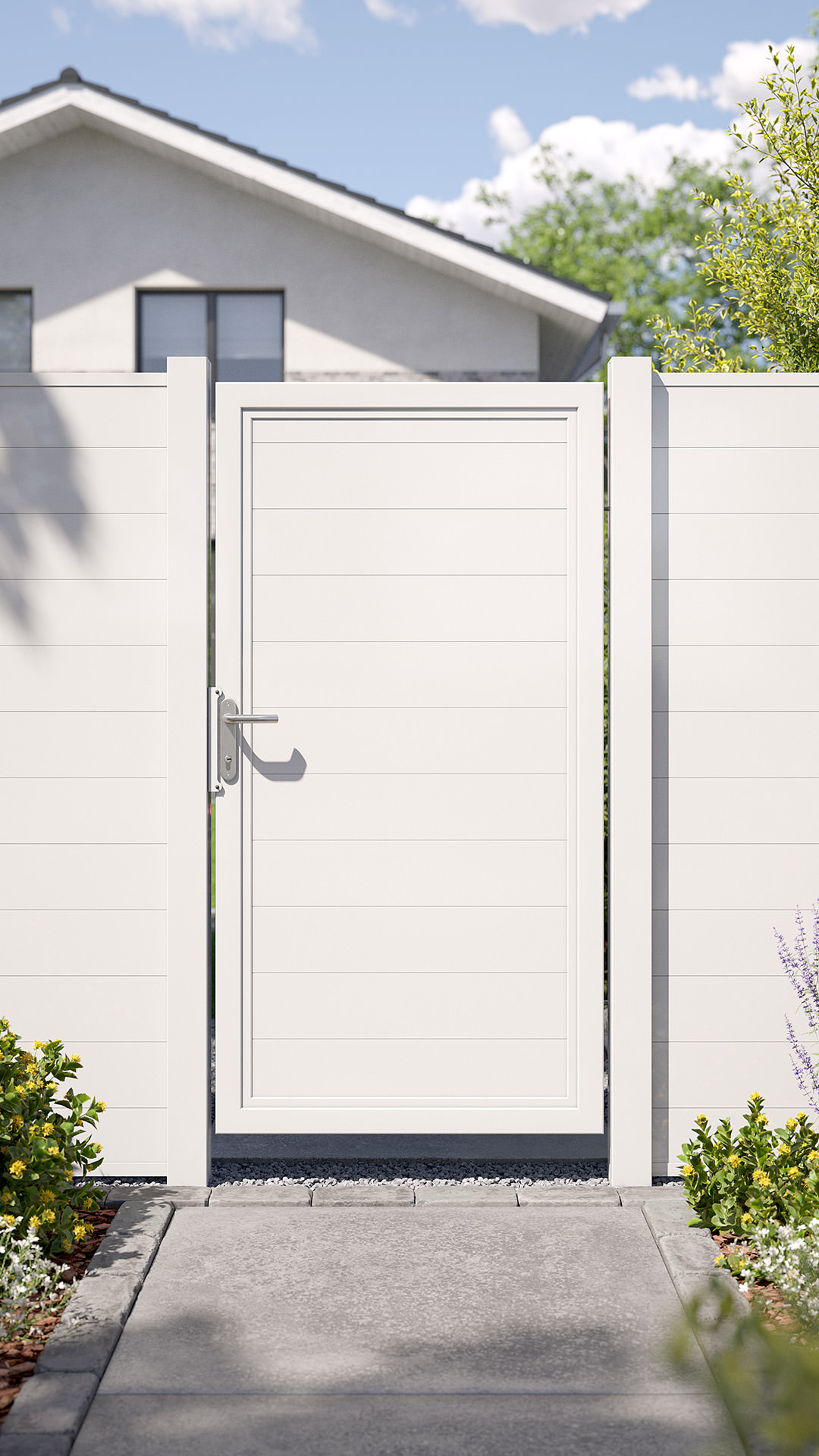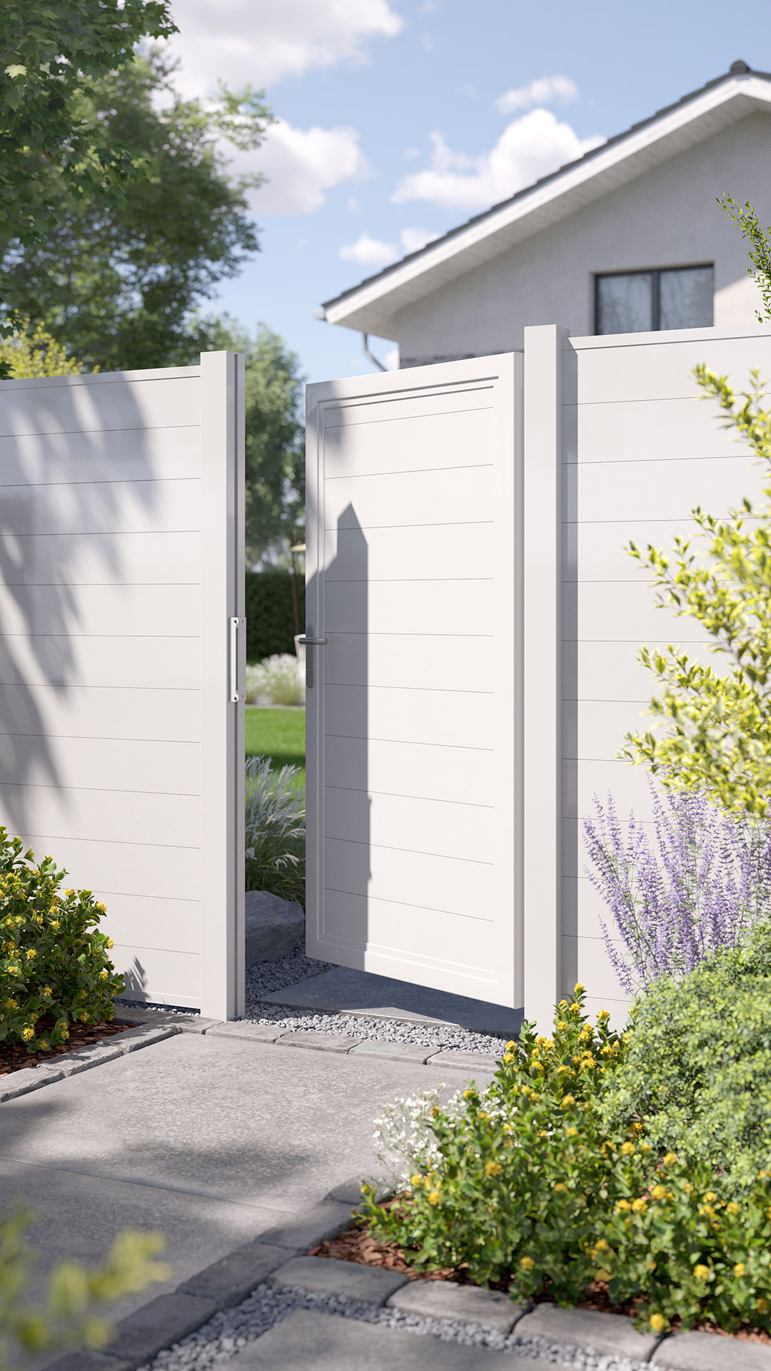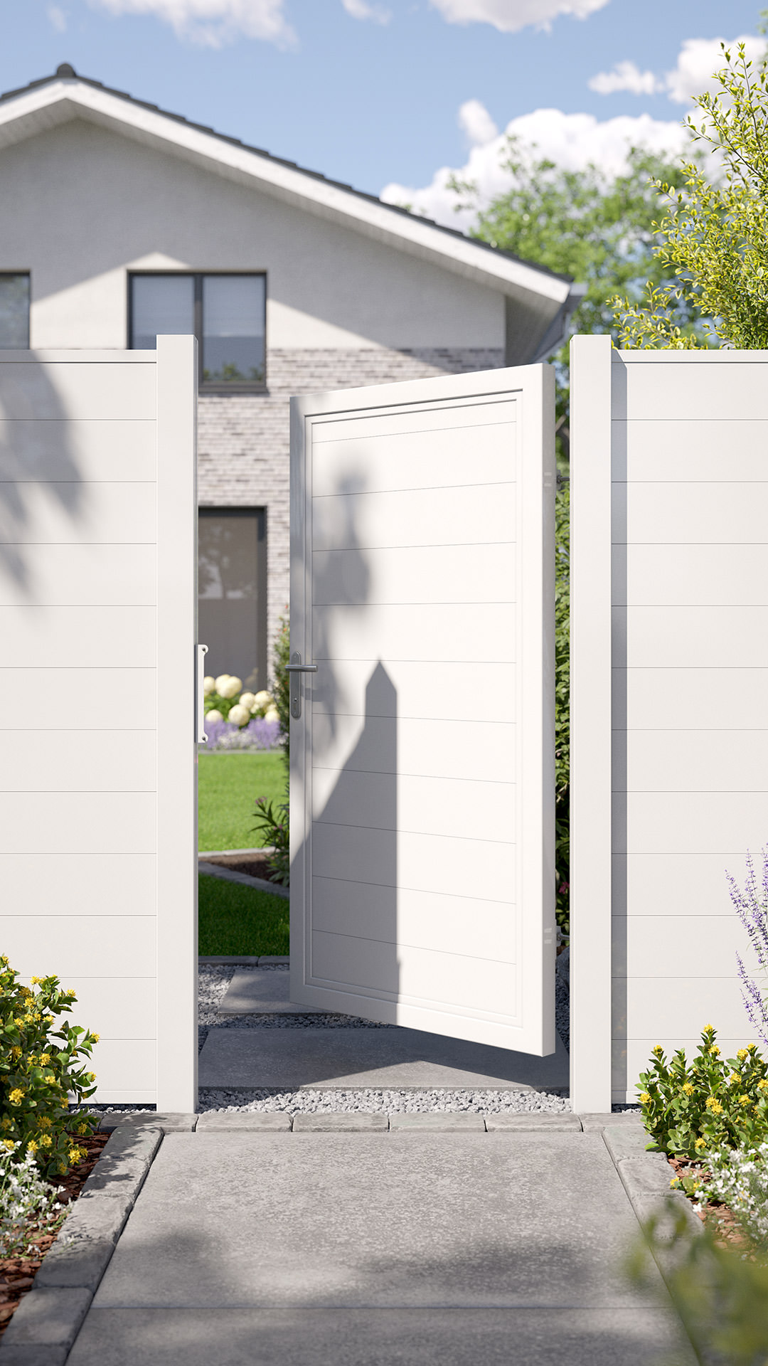 Die Torfüllung aus Trennwandprofilen ist blickdicht und sorgt als Sichtschutz für mehr Privatsphäre.