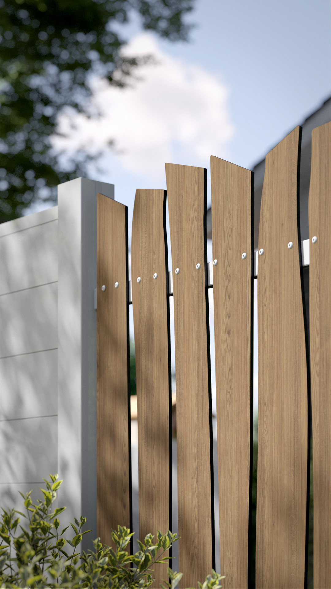- hochwertige HPL-Zaunbretter im natürlichen Holzdesign 'Teak'